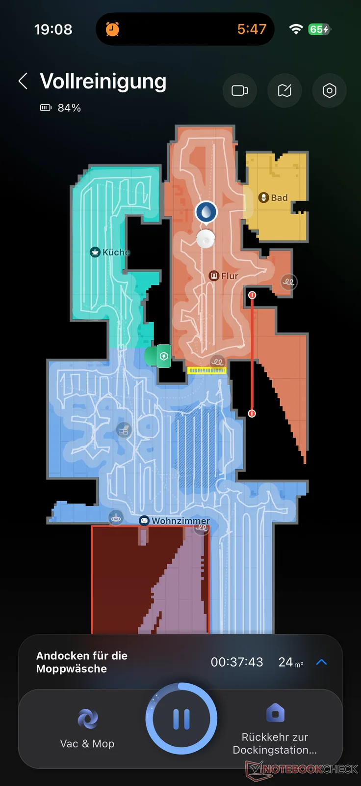 Nach der unproblematischen Einrichtung, bei welcher der Nutzer gut an die Hand genommen wird, steht die übliche Kartierungsfahrt an. Die automatische Raumerkennung hat weitestgehend gut geklappt. Manuelles Nacharbeiten wie einzelne Raumnamen oder Sperrzonen ist schnell erledigt. Nach gut 10 Minuten war der Saug- und Wischroboter einsatzbereit.
