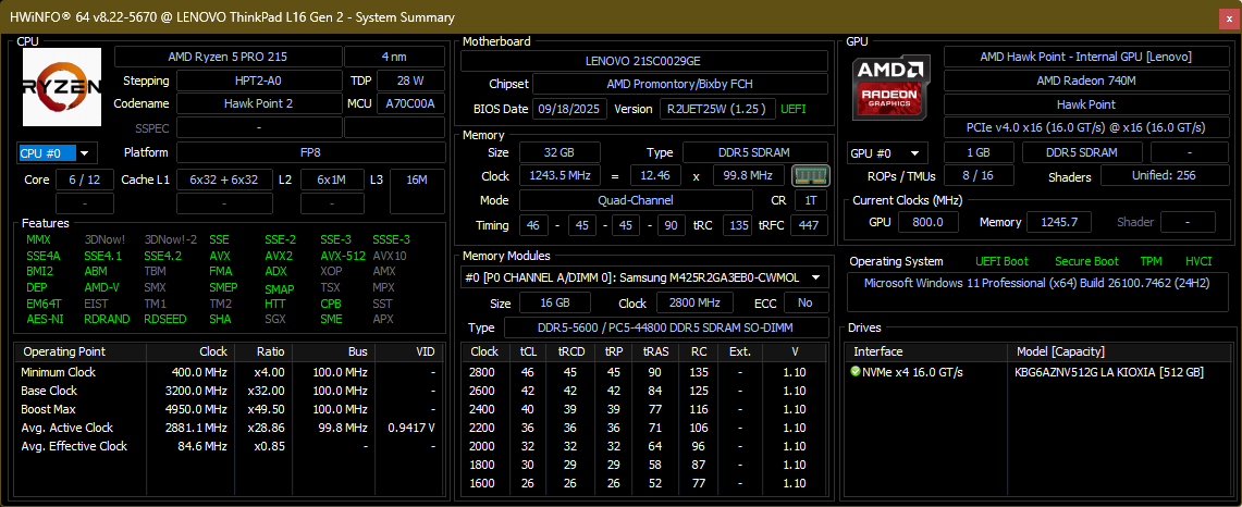 Anstelle älterer Zen3+ CPUs wie bei seinem Vorgänger bietet das Lenovo ThinkPad L16 Gen 2 die Wahl zwischen verschiedenen Zen4- und Zen5-CPUs, mit dem AMD Ryzen AI 7 Pro 350 als Speerspitze. dGPUs sind nicht verfügbar, da Lenovo sich ausschließlich auf die iGPUs der CPUs verlässt. Der Arbeitsspeicher kann dank zweier DDR5-5600 SO-DIMM-Steckplätze mit bis zu 64 GB konfiguriert werden. Und eine einzelne M.2 2280 NVMe PCIe 4.0 SSD stellt den Massenspeicher dar.