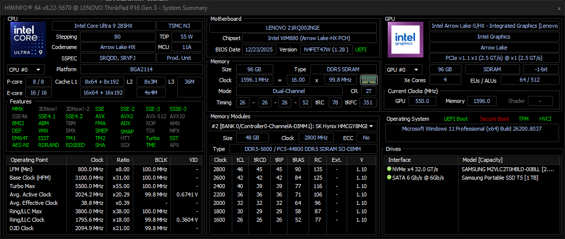 | Lenovo ThinkPad T16g Gen 3 RTX 5080 Intel Core Ultra 9 275HX ⎘ NVIDIA GeForce RTX 5080 Laptop ⎘ 64 GB RAM, 2048 GB SSD | Amazon: 1. 4.066,79 € Lenovo ThinkPad P16 Gen 3 21... 2. Lenovo ThinkPad P16v Gen 3 2... 3. 2.021,18 € Lenovo ThinkPad P16s Gen 4 2... Bestpreis 4616.89€ playox.de 2. 4616.9€ HEINZSOFT 3. 4616.9€ office-partner.de | 2.6 kg | 29.8 mm | 16.00" 3200x2000 236 PPI OLED | |