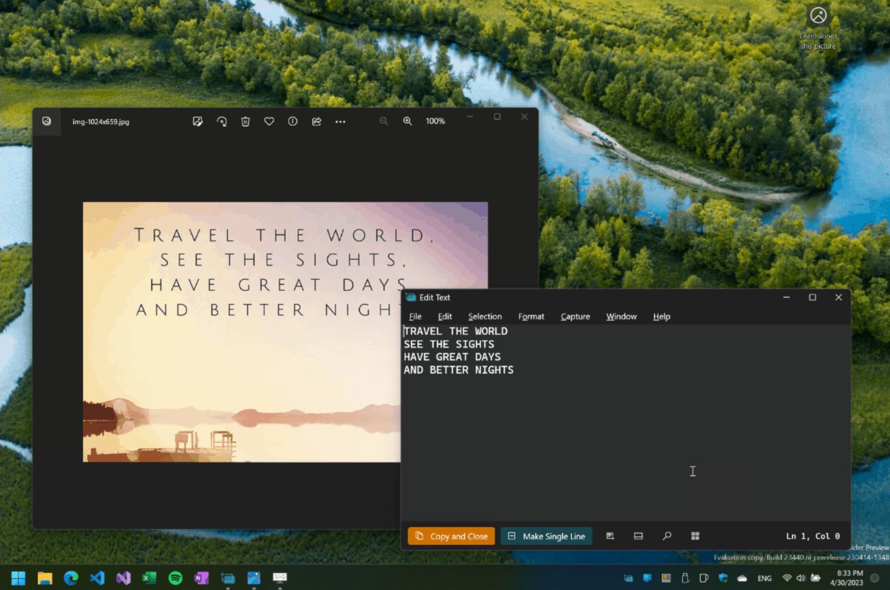 Die 74 MB kleine App hat mehrere Modi: Man kann den ganzen Screen fotografieren und nach Text absuchen lassen, man kann nur einen kleinen Bereich umrahmen oder gar auf ein einzelnes Wort klicken. Dazu kann das Tool automatisch das Notepad mit dem kopierten Text darin aufrufen, sodass man diesen noch bearbeiten kann.