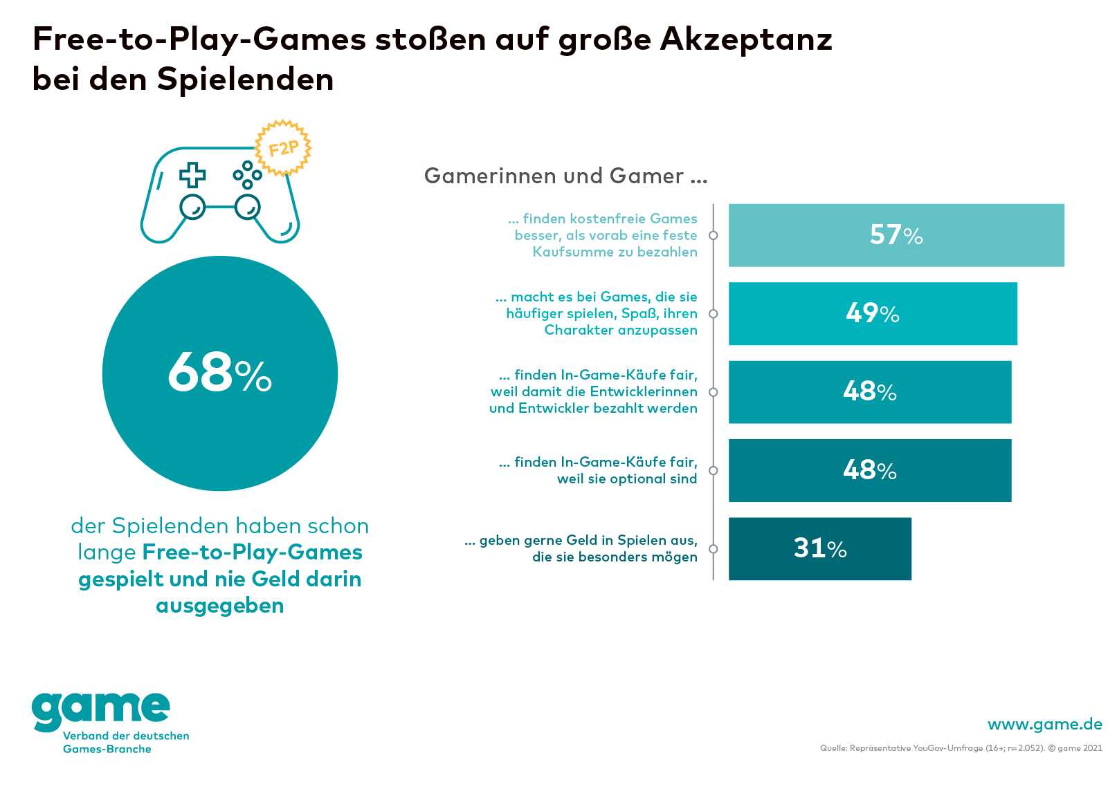 Bei den Lieblingsspielen der Deutschen werden insbesondere Free-to-Play-Games besonders gerne gespielt. Rund zwei Drittel aller Spielenden in Deutschland gaben in der Umfrage an, schon lange Free-to-Play-Spiele zu daddeln, ohne dafür Geld auszugeben. Knapp 6 von 10 Spielerinnen und Spieler finden diese Art der digitalen Spiele besser, als vorab eine feste Kaufsumme fürs Game zahlen zu müssen. Außerdem findet rund jeder zweite Spielende derlei In-Game-Käufe, mit denen sich Free-to-Play-Spiele finanzieren, eine faire Option, um die Entwicklung der Spiele zu finanzieren.