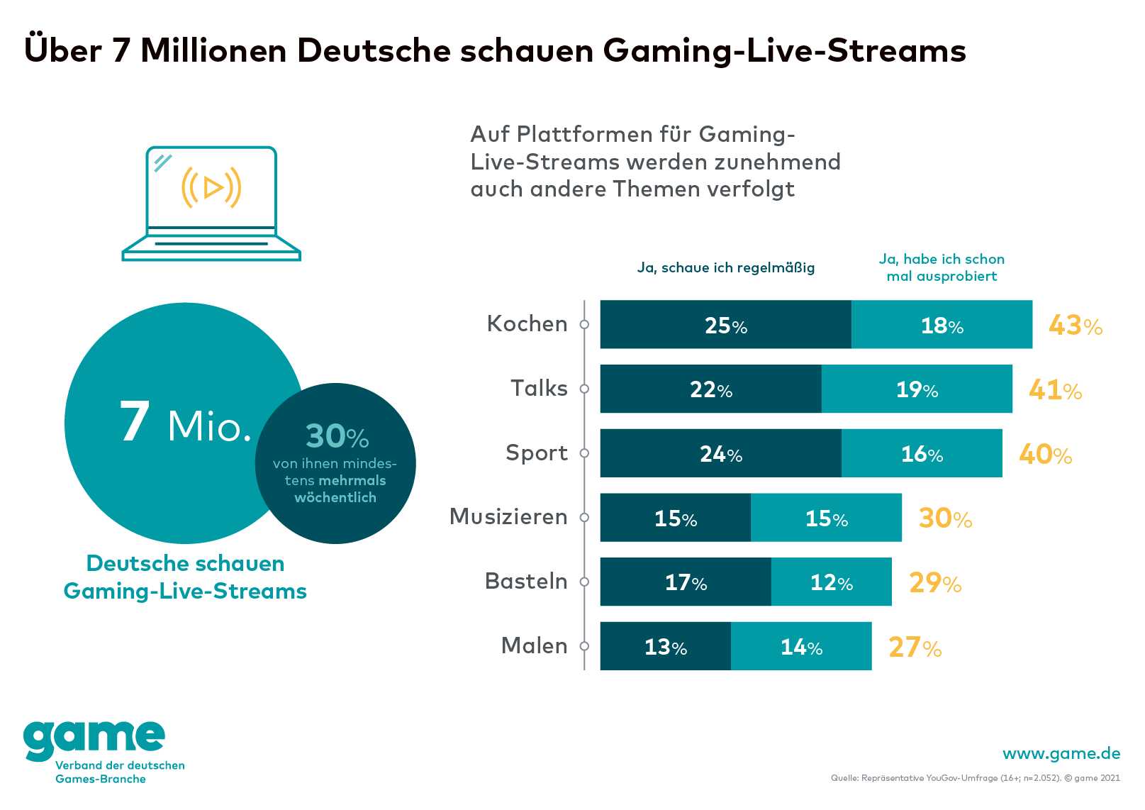 Nicht zuletzt wegen Corona hat sich der Gamer-Kultur-Trend "Live-Streaming" zu einem wahren Hype entwickelt. Kaum ein anderer Bereich weist ein derart starkes Wachstum auf. Live-Übertragungen auf Plattformen wie Twitch, YouTube oder Facebook Gaming, bei denen die Community aktiv einbezogen wird, sind inzwischen das "Lagerfeuer der digitalen Zeit". Über 7 Millionen Menschen in Deutschland nutzen derzeit bereits entsprechende Plattformen für Gaming-Live-Streams, rund jeder dritte von ihnen mindestens mehrmals in der Woche.