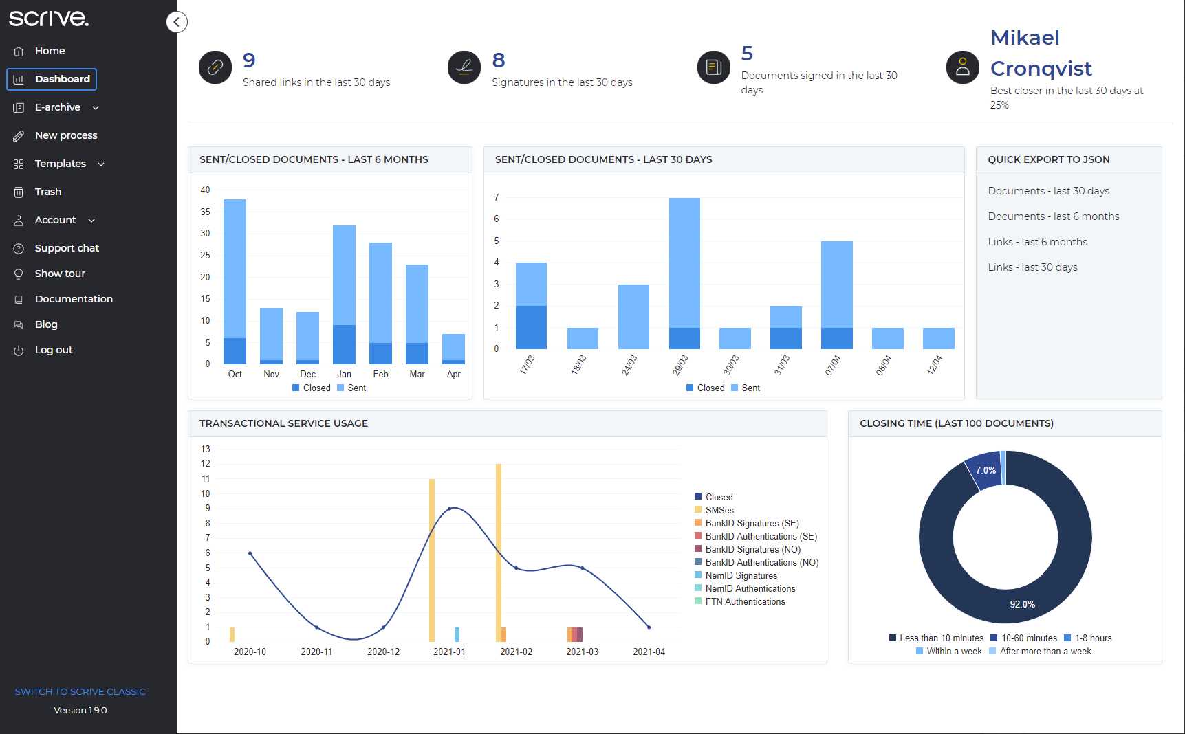 Immer mehr Dienstleistungen werden online angeboten, Tendenz rasch steigend. Besonders Firmen sind damit gefordert, für Sicherheit und Datenschutz sowie eine kommode Benutzererfahrung mit einer E-Sign-Lösung zu sorgen. Jedes mit Scrive signierte Dokument wird mit Blockchain-Technologie digital versiegelt und ist daher vor Betrug und Fälschungen gesichert.