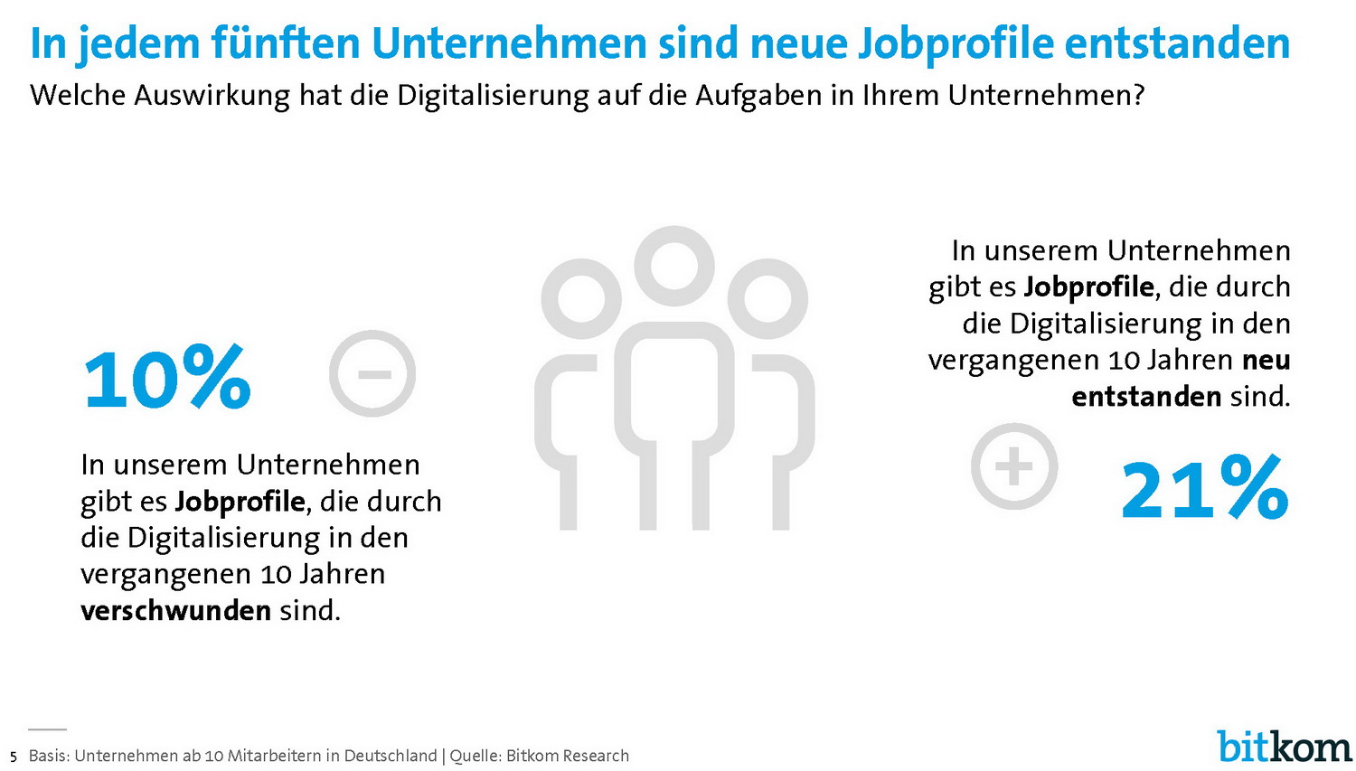 Jedes zehnte Unternehmen (10 Prozent) berichtet davon, dass bestimmte Berufsprofile wie beispielsweise Schriftsetzer oder Lagerist komplett verschwunden sind. In jedem fünften Unternehmen (21 Prozent) sind aber neue Profile entstanden, etwa Softwareentwickler, Datamining-Spezialist oder Roboter-Koordinator.