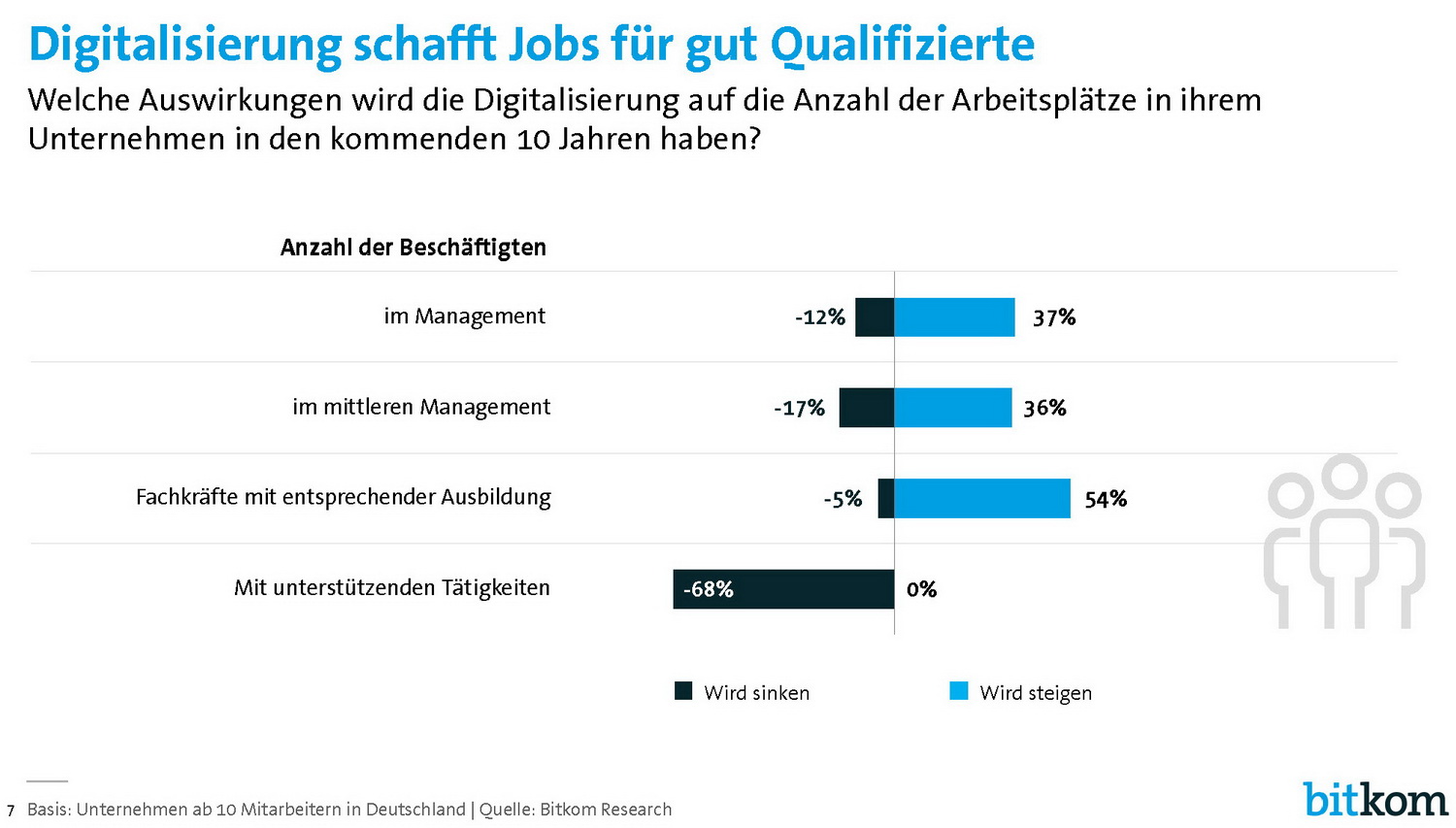 Im Bereich Management rechnen 37 Prozent mit mehr Jobs, 12 Prozent mit weniger. Im mittleren Management sind es 36 respektive 17 Prozent. Diese Ergebnisse gehen aus einer repräsentativen Befragung unter 500 Unternehmen ab 10 Mitarbeitern in Deutschland im Auftrag des Digitalverbands Bitkom hervor, die heute vorgestellt wurde. Im Zuge der Studie ist davon auszugehen, dass andererseits die Anzahl der Beschäftigten mit geringen Qualifikationen und unterstützenden Tätigkeiten sinken wird. Davon gehen 68 Prozent der Befragten aus.