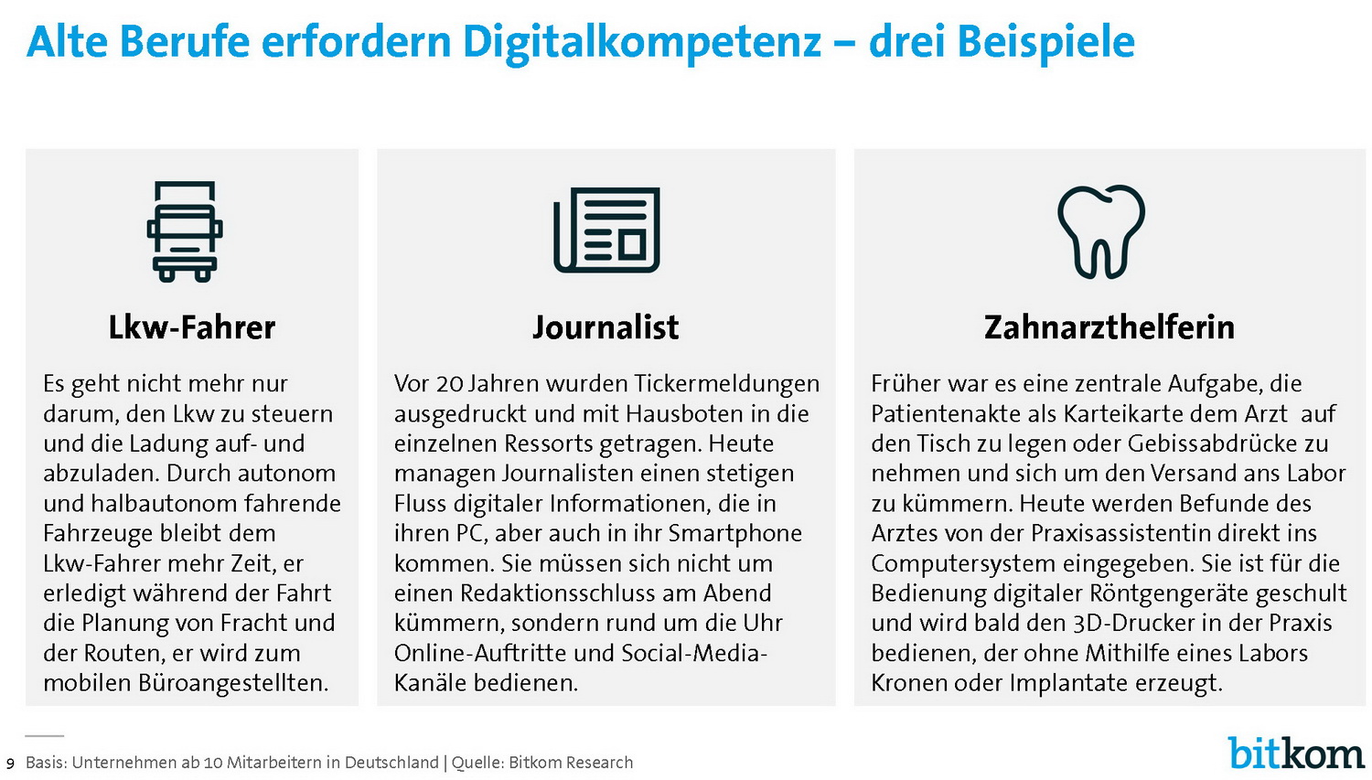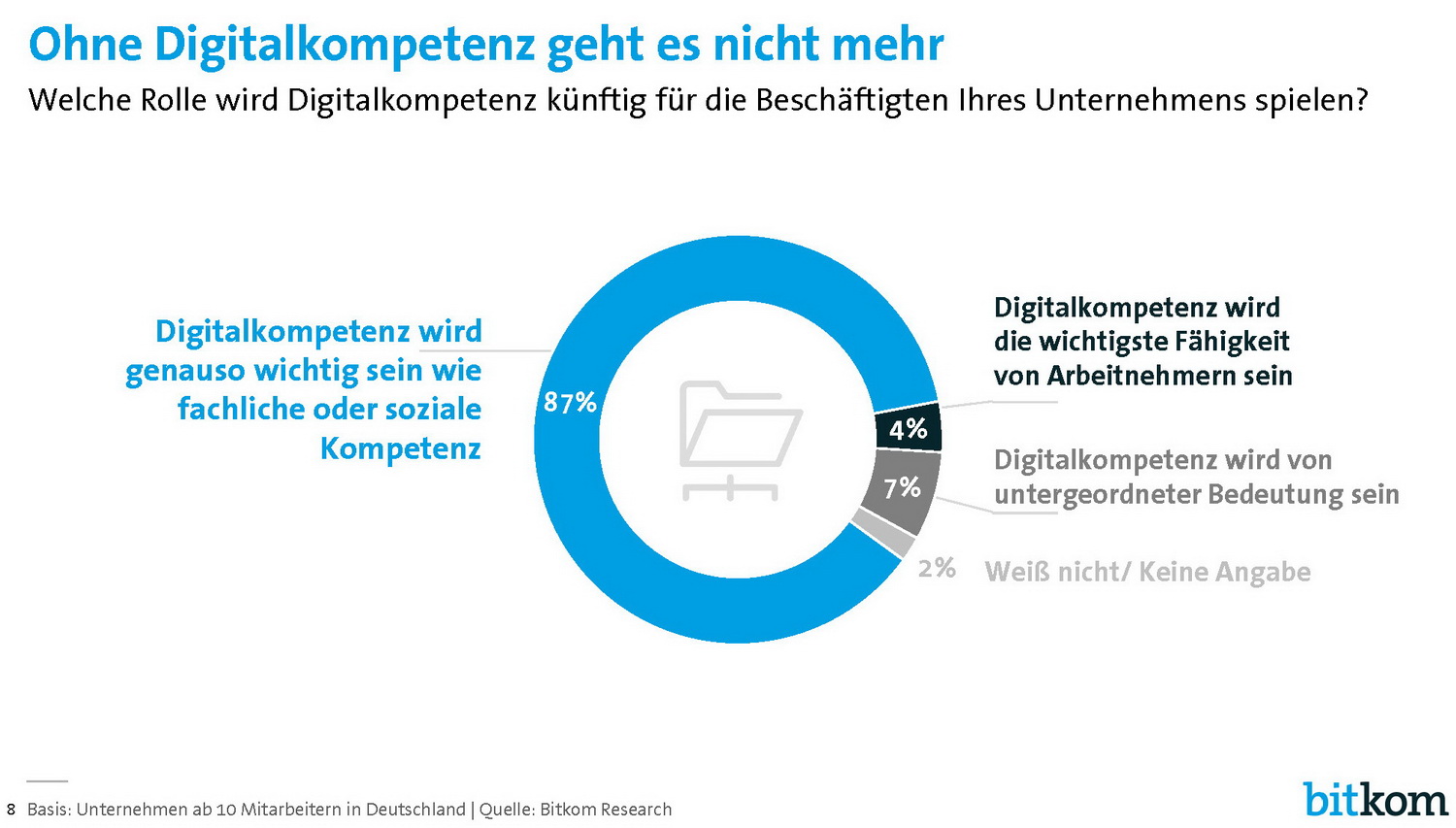 87 Prozent der Unternehmen in Deutschland rechnen damit, dass die "Digitalkompetenz" der Beschäftigten genauso wichtig wird, wie fachliche oder soziale Kompetenz. 4 Prozent erwarten sogar, dass Digitalkompetenz zur wichtigsten Fähigkeit von Arbeitnehmern wird. Bereits in den vergangenen 10 Jahren haben sich die Aufgaben in den Unternehmen durch die Digitalisierung verändert, so der Bitkom.