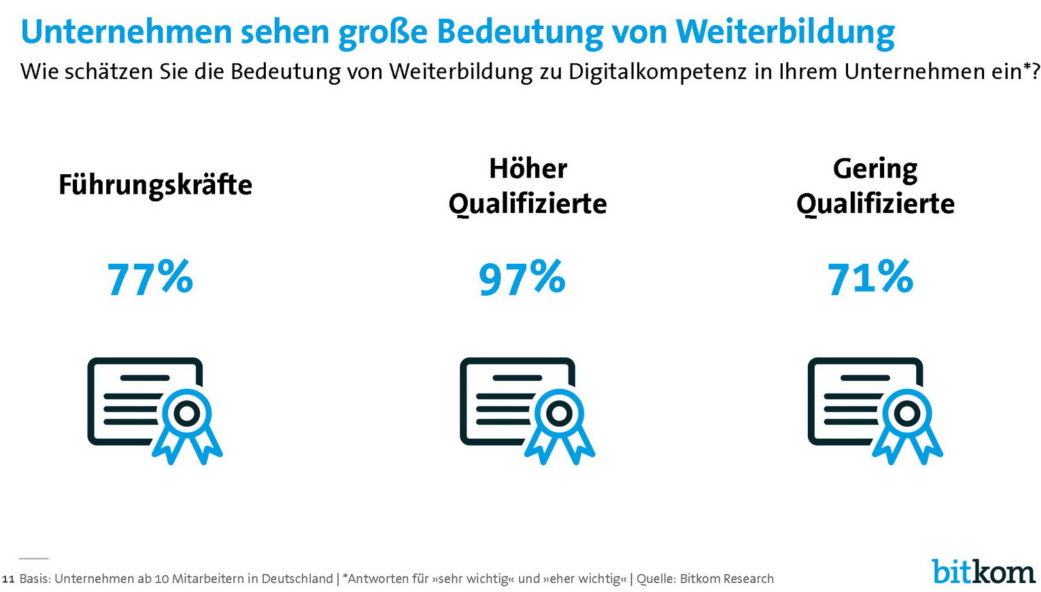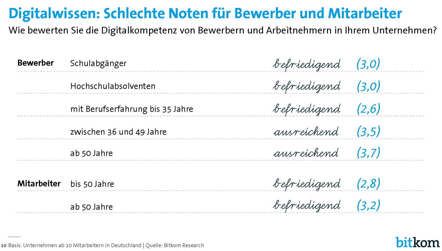 Unternehmen messen der Weiterbildung rund um Digitalthemen eine besonders große Bedeutung zu. 97 Prozent halten diese für qualifizierte Fachkräfte im Unternehmen für wichtig, jeweils rund drei Viertel für Führungskräfte (77 Prozent) und gering Qualifizierte (71 Prozent). Aktuell wird die Digitalkompetenz von Bewerbern und eigenen Mitarbeitern nur mit den Durchschnittsnoten "befriedigend" oder "ausreichend" bewertet.