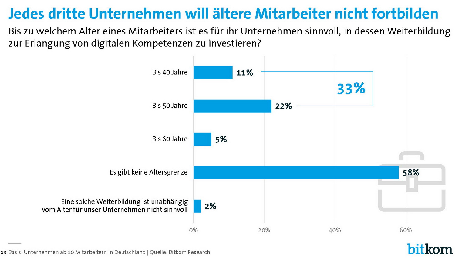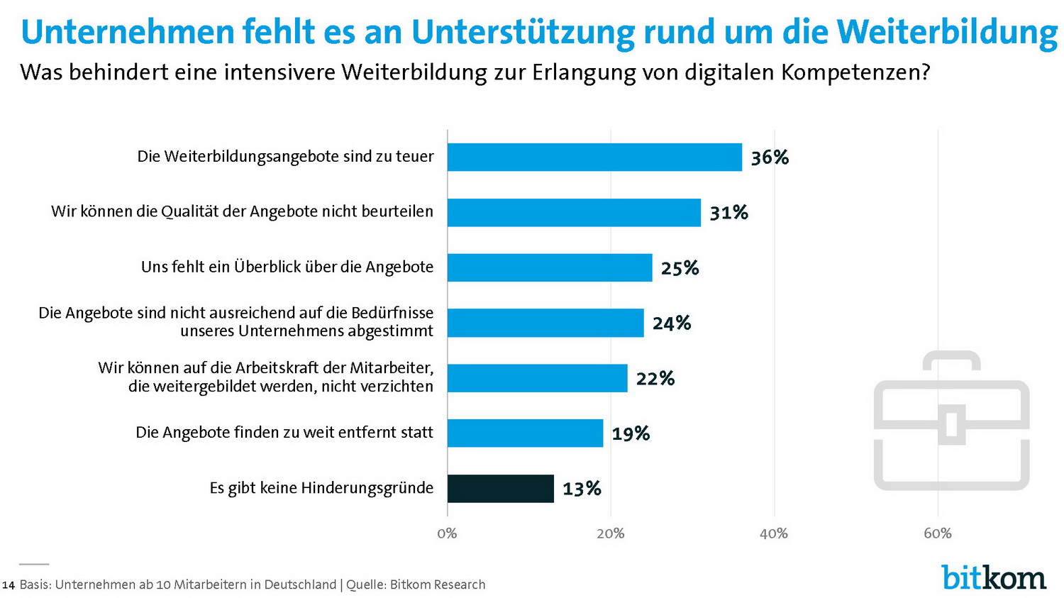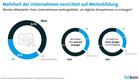 Trotz dieser Selbsteinschätzung investieren die Unternehmen selber nur wenig in Weiterbildung: 62 Prozent geben an, dass die eigenen Mitarbeiter in Digitalkompetenzen nicht weitergebildet werden. Dabei sind kleinere Unternehmen bis 50 Mitarbeiter mit 67 Prozent nochmals deutlich zurückhaltender als größere Unternehmen mit 51 Prozent. Und nur 31 Prozent haben eine zentrale Strategie, wie die Mitarbeiter Digitalkompetenzen erlangen sollen, nur 27 Prozent haben dafür ein festes Budget eingeplant.