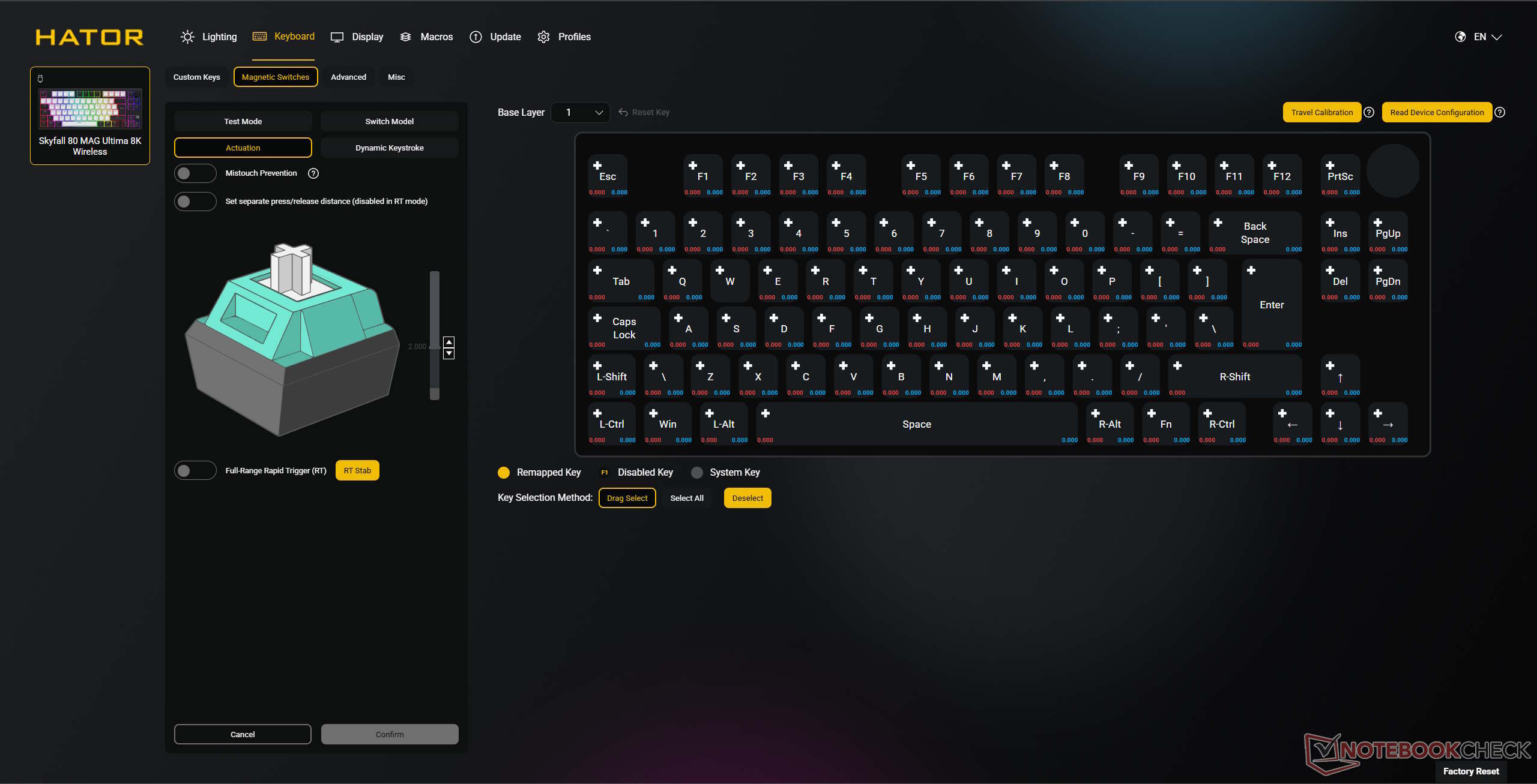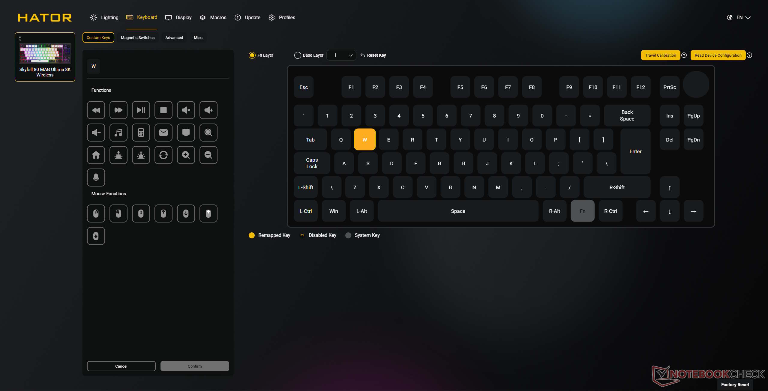 Im Hands-on wurden Tastatureingaben jederzeit problemlos registriert. Das Tippgefühl ist typisch für derartige, quasi-analoge Taster: flüssig ohne eine starke Spitze am Auslösepunkt. Trotzdem ergeben sich präzise Tastenanschläge, ein Verhaken oder Ähnliches ist nicht anzutreffen - gleichwohl wäre dies auch mehr oder weniger ein absolutes KO-Kriterium. Positiv aufgefallen sind uns die Software-Optionen: So gibt es sowohl eine Weboberfläche als auch eine Desktop-Software, welche beide alle nötigen Einstellungsmöglichkeiten mitbringen. Wohlgemerkt ist die deutsche Übersetzung ein wenig eigentümlich. Es lassen sich beispielsweise der Auslösepunkt genau und tastenspezifisch bestimmen. Zudem gibt es die Möglichkeit, verschiedene Funktionen auf eine Taste zu legen. Die Makro-Programmierung ist völlig unkompliziert mit durchaus vielen Funktionen möglich. Über die FN-Schicht lässt sich das Gros der Tasten noch einmal mit anderen Funktionen belegen und das nicht nur mit komplexeren Makros, sondern quasi gleichzeitig ausgelösten Tastenkombinationen für bis zu drei Tasten. Windows- und Multimedia-Funktionen lassen sich ebenfalls auf Tasten legen. Die Funktionstasten sind sinnvoll vorbelegt. Wird eine Wireless-Verbindung genutzt, dauert die Übernahme der Einstellung durchaus mehrere Sekunden. Darauf wird hingewiesen, optimal ist das nicht.