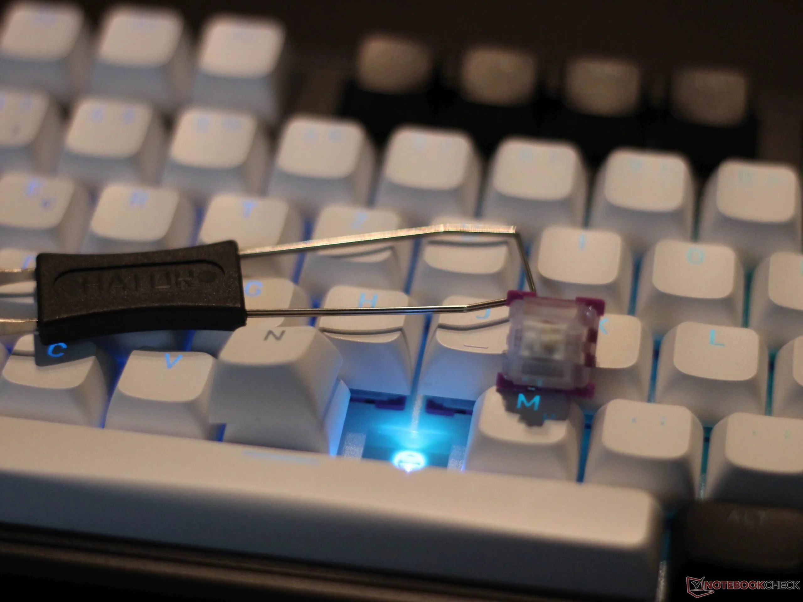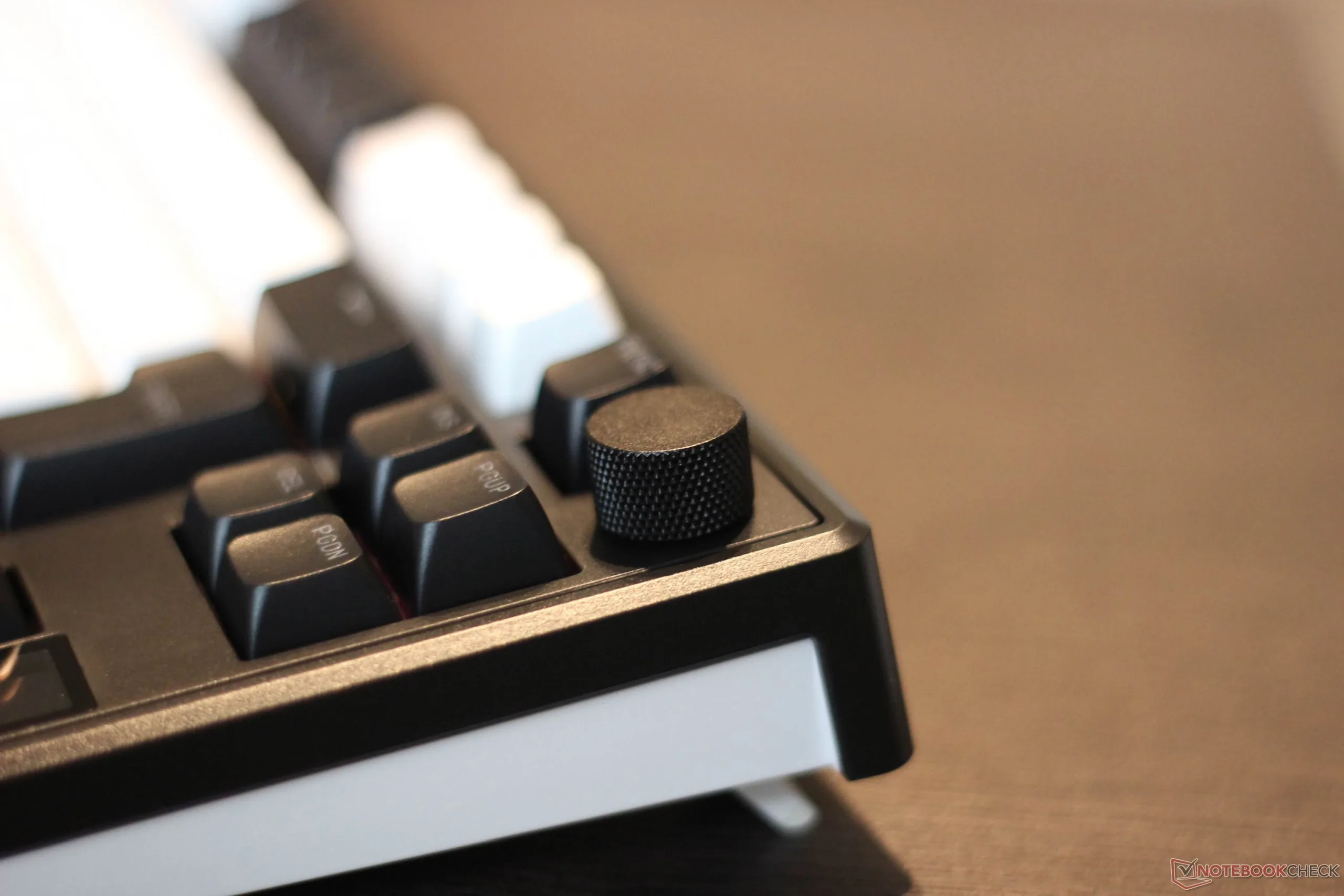 Die Tastatur kommt im 80-Prozent-Layout. Das bedeutet, dass der Ziffernblock fehlt, allerdings gibt es den Sechserblock in angepasster Form. Hator verbaut auch einen zusätzlichen Drehregler, welcher der Steuerung der Lautstärke dient. Mit einem Druck auf diesen lässt sich die Audioausgabe stummschalten. Das Layout ist grundsätzlich sinnvoll. Zusätzliche Medientasten fehlen, allerdings ist dies nur beschränkt problematisch - dazu später mehr. Die Tastatur ist dabei trotz des relativ günstigen Preises sehr ordentlich verarbeitet. Im Vergleich zur Asus ROG Azoth 96 HE lässt sich die Tastatur mit doch sehr viel Kraft allerdings verwinden. Ein echtes Problem stellt das nicht dar. Es kommen PBT-Tastenkappen zum Einsatz, welche sich ebenso wie die Taster auswechseln lassen. Das nötige Werkzeug ist enthalten. Im Lieferumfang sind ein knapp über 1,8 Meter langes USB-Kabel, ein USB Typ A- zu Typ C-Adapter und der 2,4-GHz-Empfänger und zusätzliche Tastenkappen für verschiedene, europäische Länder enthalten. Die Anbindung über Bluetooth wird ebenfalls unterstützt.