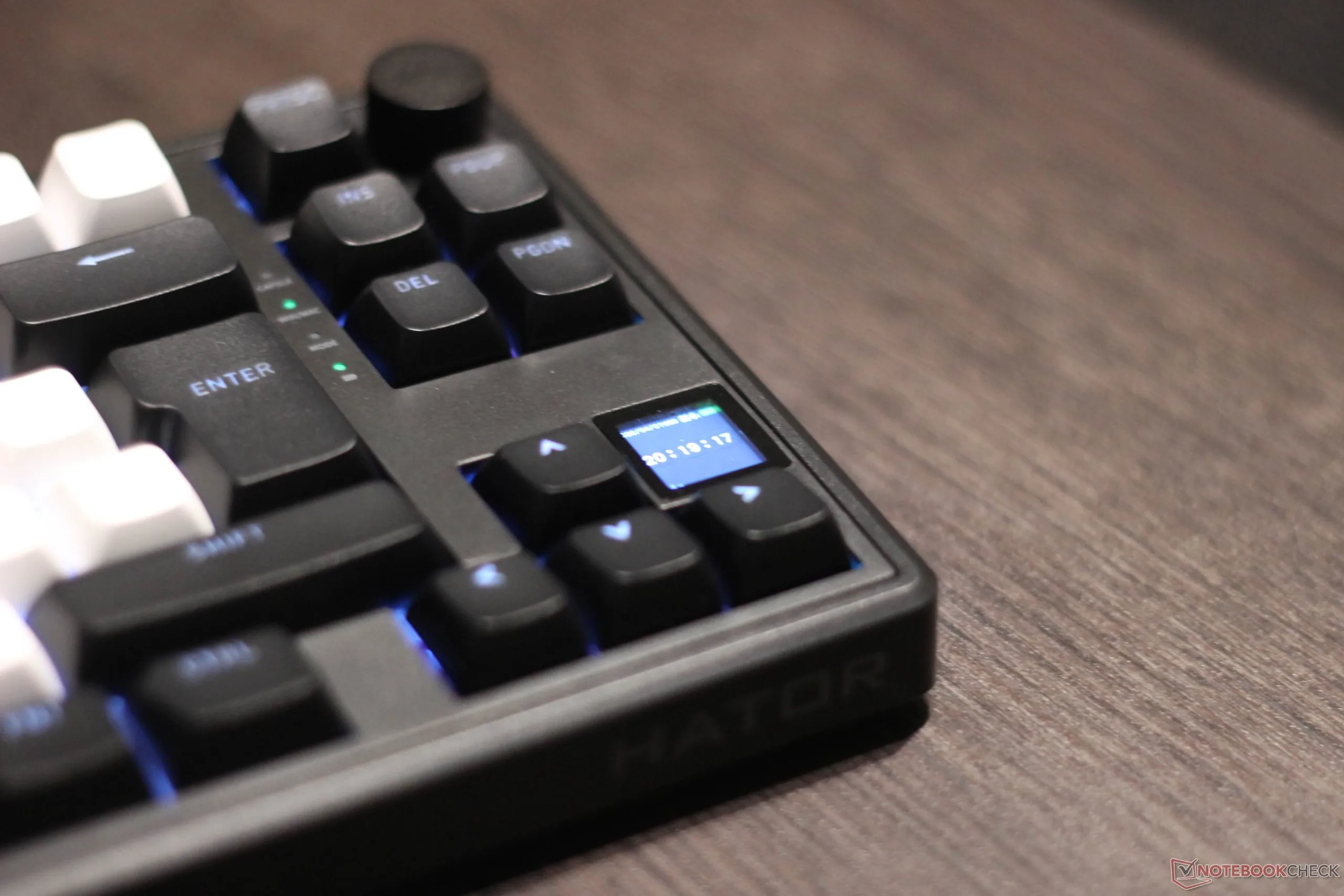 Man kommt eigentlich nicht mehr drumherum: Eine RGB-Beleuchtung bietet die Hator Skyfall 80 MAG Ultima Wireless 8K ebenfalls, welche sich auch für einzelne Tasten konfigurieren lässt. Zudem gibt es eine Beleuchtung an der Seite. Die RGB-Beleuchtung ist für Nutzer, die es wollen, durchaus ein Mehrwert, die Beleuchtung aller schwarzen Tasten ist aber deutlich schlechter erkennbar. Apropos Mehrwert: Die Tastatur kommt mit einem sehr kleinen Display. Dieses zeigt die Uhrzeit, Verbindungsart, Eingabeprofil und auch die aktivierte Umschalttaste an. Eigene Bilder oder Animationen lassen sich ebenfalls anzeigen. Wirklich gebraucht hätte es diese aber nicht unbedingt, die Ablesbarkeit ist nicht optimal.