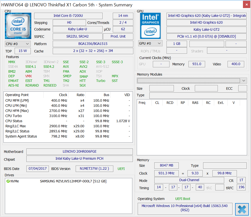 | Lenovo ThinkPad X1 Carbon 2017-20HR006FGE i5-7200U, HD Graphics 620, 57 Wh, 2560x1440 | Lenovo ThinkPad X1 Carbon 2017-20HR0021GE i5-7200U, HD Graphics 620, 57 Wh, 1920x1080 | Lenovo ThinkPad X1 Carbon 2017-20HQS03P00 i7-7500U, HD Graphics 620, 57 Wh, 1920x1080 | Lenovo ThinkPad X1 Carbon 20FB003RGE 6500U, HD Graphics 520, 52 Wh, 2560x1440 | Lenovo ThinkPad X1 Carbon 20FB-005XUS 6300U, HD Graphics 520, 52 Wh, 1920x1080 | |
