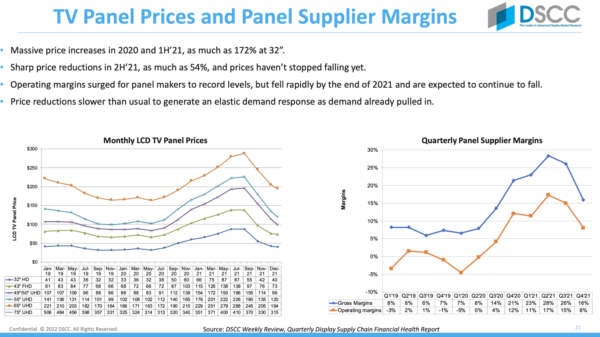 Im Bereich LCD steigerte sich bis Mitte 2021 die Auslastung der Fabriken um etwa 10 Prozentpunkte auf Spitzenwerte von 90 bis 93 Prozent. Das hatte auch Auswirkungen auf den TV-Markt. 32-Zoll-HD-Panel stiegen im Preis etwa von 32 US-Dollar Ende 2019 auf 87 Mitte 2021. Bei größeren Displays war der Anstieg moderater. 75-Zoll-Displays steigen etwa von 321 US-Dollar auf 410 in der Spitze in einem ähnlichen Zeitraum.
