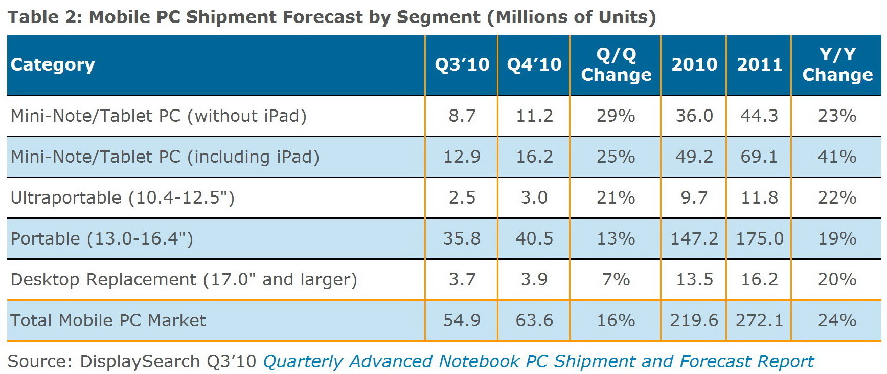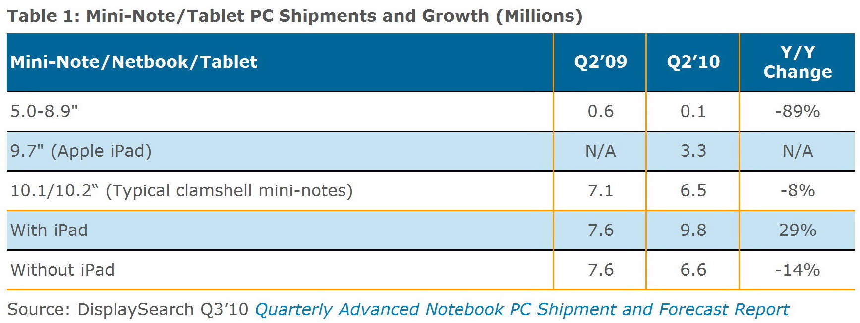 Im Bereich der mobilen PCs mit Displaygrößen von 9,7 bis 10,2 Zoll rettete Apples iPad mit rund 3,3 Millionen ausgelieferten Geräten die positiven Quartalszahlen. So fielen die Stückzahlen für Netbooks und Tablets mit 10,1- und 10,2-Zoll-Displays ohne Apples iPad zwar von 7,1 Millionen Einheiten in Q2/2009 auf 6,5 Millionen Geräte (Minus von 8 Prozent) in Q2/2010. Unterm Strich ist die Bilanz dank diesem „iPad-Effekt“ aber schwarz: ein Plus von 29 Prozent.