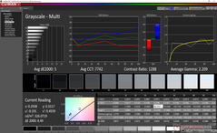 Weitere Messungen mit einem X-Rite-Farbmessgerät bestätigen unsere obigen Vermutungen, da die Farbtemperatur mit 7.742 viel zu kühl ist. Dadurch werden die Graustufen und das Farbgleichgewicht verfälscht und weniger genau dargestellt, als es eigentlich möglich wäre. Wie unsere CalMAN-Ergebnisse unten zeigen, kann eine Kalibrierung Abhilfe schaffen und die Genauigkeit des Displays deutlich verbessern. Die endgültigen Delta-E-Werte liegen im Schnitt bei nur 2 bzw. 2,05. Um das Display optimal zu nutzen, empfehlen wir wenn möglich eine Kalibrierung, andernfalls kann auch unser oben verlinktes, vorkalibriertes ICM-Profil angewandt werden.