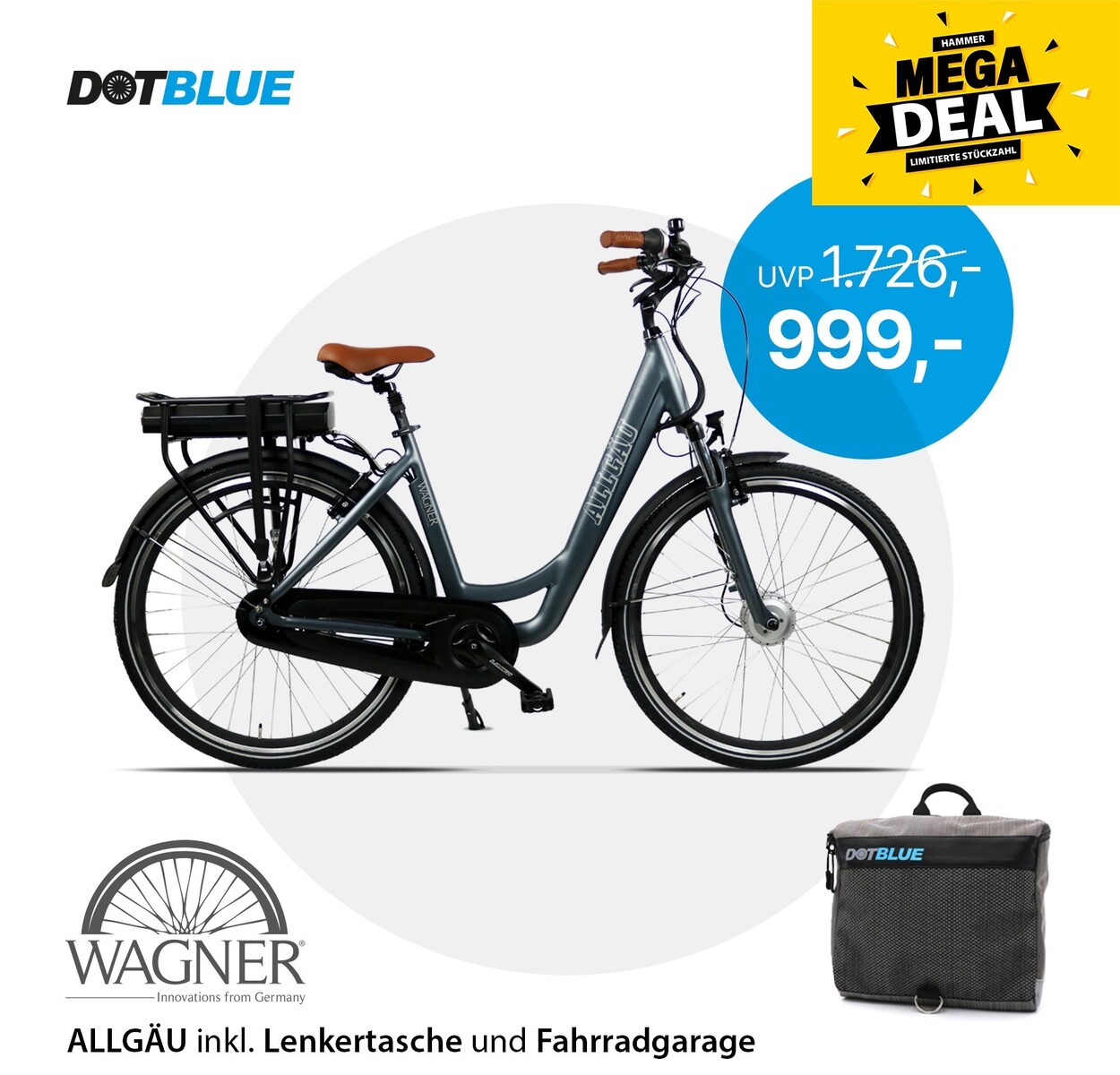 Jetzt launcht der Anbieter mit seiner Eigenmarke Wagner das sportlich-elegante 28-Zoll-E-Cityrad Wagner Allgäu als "Mega-Deal-Paket" für nur 999 Euro inklusive kostenlosem Versand. Im Im Paket zum Wagner City-E-Bike mit 28 Zoll schenkt der Anbieter allen Käuferinnen und Käufern eine kostenlose Lenkertasche und eine Fahrradschutzhaube dazu. Im Dotblue-Webshop wird für das Wagner Allgäu ein UVP von 1.726,89 Euro genannt.