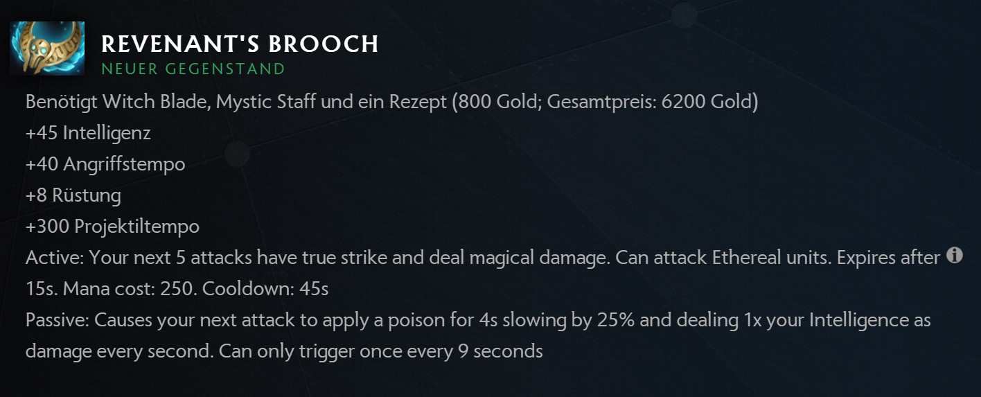 "Revenant’s Brooch" kostet 6200 Ingame-Gold und zählt eher zu den Lategame-Items. Es ist die Erweiterung des "Witch Blades" und wird somit wohl zu der Standardwaffe von Silencer und anderen magischen Damagedealern. Jedoch auch aus der Position als Phantom Assassin kann es sehr nützlich werden, wenn das gegnerische Team mit "Ethereal Blade" countert, um sich vor physischen Angriffen zu schützen. Denn Revenant’s Brooch verfügt über die aktive Fähigkeit, mit physischen angriffen auch Gegner zu verletzen, die in der ätherischen Form sind.