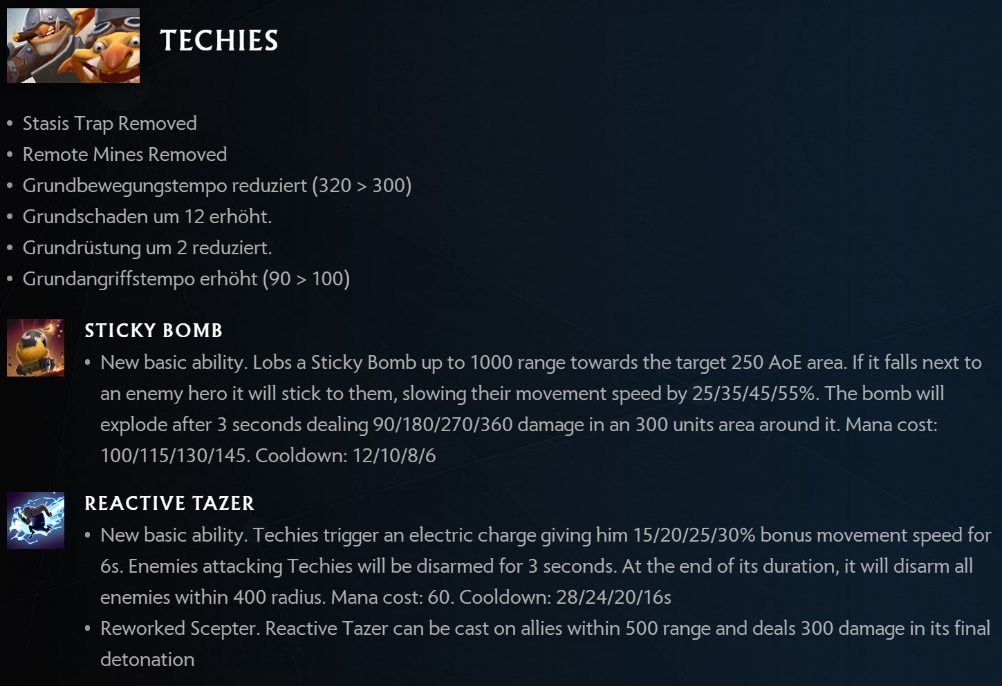 Techies war schon immer der Außenseiter unter den Helden, allerdings häufig weil die Spielweise die Falsche war. Wenn man den Helden gut beherrschte und seine Fähigkeiten nicht zu defensiv eingesetzt hat, konnte man mit Techies durchaus großen Schaden anrichten. Wahrscheinlich wurde Techies deshalb nun praktisch komplett von Valve auf den Kopf gedreht. Oftmals verfielen Spieler darin, mit Techies die Map mit Minen voll zu machen. Durch diese Taktik spielte das eigene Team eigentlich nur noch zu viert gegen das gegnerische, voll besetzte Team. Dann eben auch meistens genau da, wo keine Minen liegen. So hat Techies also einen kompletten Rework seiner Skills erhalten und kann jetzt nur noch offensiv auf der Lane selbst gespielt werden. Sowohl die "Stasis- als auch die Remote-Mines" wurden komplett entfernt. Dafür ist jetzt die "Proximity-Mine" die ultimative Fähigkeit und "Blas-Off" wurde leicht überarbeitet. Hinzugekommen sind die zwei neuen Fähigkeiten "Sticky Bomb" und "Reactive Tazer". Die "Sticky Bomb" verlangsamt den Gegner und fügt ihm auch (teilweise) zeitverzögert Schaden zu. Der "Reactive Tazer" entwaffnet Gegner und verleiht einem selbst zusätzliche Laufgeschwindigkeit. Aber eben alles nicht aus der Ferne, sondern direkt im Spielgeschehen und in den wichtigen Teamfights im Mid- und Lategame. So zwingt Valve jeden Techies-Spieler, wieder mehr mit seinen Teamkameraden zu spielen und zu interagieren.