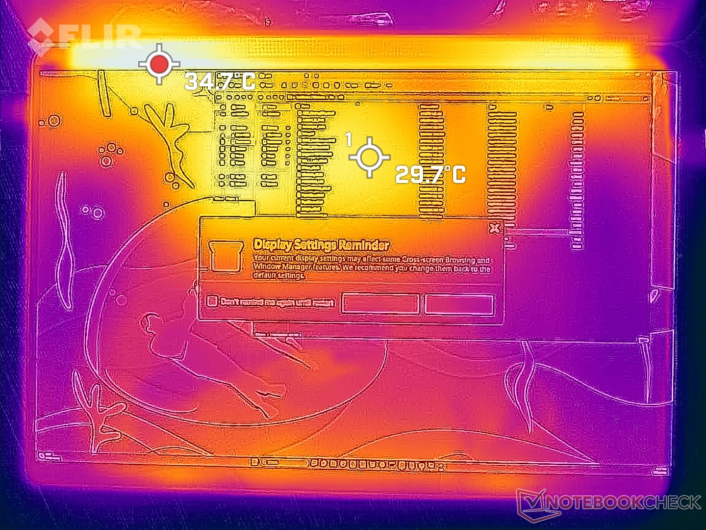 Die Oberflächentemperaturen sind meistens an jeder Stelle gleich, wobei der wärmste Bereich auf der Unterseite beim Lüfter ist. Dieser erreicht dabei 35 °C, wenn man über eine längere Zeit anspruchsvolle Programme ausführt. Diese Ergebnisse haben wir auch beim HP Envy x360 13 erhalten. Das Subnotebook wird also nie sehr unangenehm heiß. Diverse Modelle anderer Firmen werden deutlich wärmer, wie zum Beispiel der Framework Laptop 13.5 oder das Dell XPS 13 Plus, welche unter Volllast teilweise bis zu 45 °C erreichen.