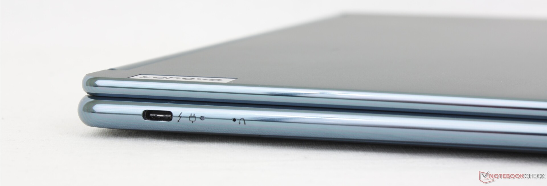 Die einzigen verfügbaren Anschlüsse sind drei Thunderbolt-4-Ports - sonst nichts, nicht einmal ein Kopfhöreranschluss. Diese Entscheidung seitens Lenovo ermöglicht zwar die dünnen und leichten Eigenschaften des Geräts, schrenkt den Nutzer jedoch ein und macht es notwendig, Adapter oder Docking-Stationen zu verwenden. Im Vergleich bieten die meisten anderen Subnotebooks mehr Anschlüsse an.