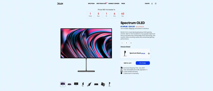 Der Dough Spectrum Gaming-Monitor kann ab sofort über die Webseite des Herstellers vorbestellt werden. Der Hersteller veranschlagt derzeit einen Preis von 849 Euro inklusive Mehrwertsteuer, plus 99 Euro für den Standfuß, wobei der Monitor dank VESA-Halterung auch mit Drittanbieter-Standfüßen verwendet werden kann. Später soll der Preis auf 1.199 Euro steigen.