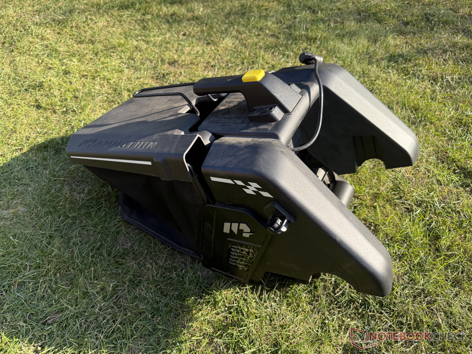 Optional kann der Mammotion Yuka mit einer Kehrmaschine ausgestattet werden. Hierbei handelt es sich um einen Fangkorb, der hinten am Mähroboter eingehängt wird und dann mit einer Gummi-Bürstenrolle Laub und Co von der Rasenfläche sammelt. Optisch sieht der Rasenmäher-Roboter dann wie ein klassischer Rasenmäher aus, allerdings ohne den Griffbügel.
