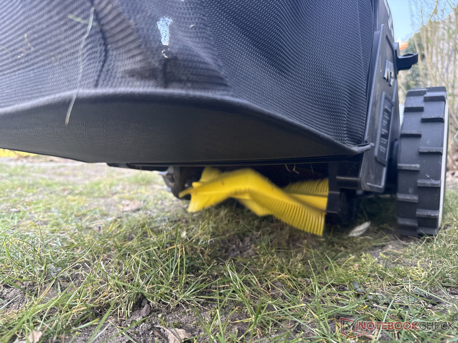 Neben einem kleinen Scheibenwischer für die beiden Kameras wartet der Yuka auf der Unterseite mit zwei Mähscheiben und nun je fünf Klingen auf. Dies sorgt für eine Schnittbreite von 32 cm. Die Schnitthöhe wird in der EU-Version zwischen 20 und 90 mm via mechanischem Drehrad eingestellt. Das Mähwerk ist schwimmend gelagert, um bei unebenem Boden ein gleichmäßiges Schnittbild zu ermöglichen. Auf die Besonderheit der optionalen Kehrmaschine gehen wir weiter unten in unserem Mammotion Yuka Test genauer ein.
