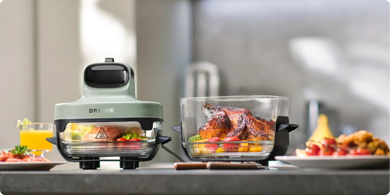 Die Heißluftfritteuse von Dreame präsentiert sich im frischen Design, das wahlweise in Grau oder Grün zur Wahl steht. Das Gerät bietet nicht nur die Möglichkeit zum Frittieren von Speisen mit heißer Luft und Dampf, sondern kombiniert auch eine Lunchbox für den Transport.