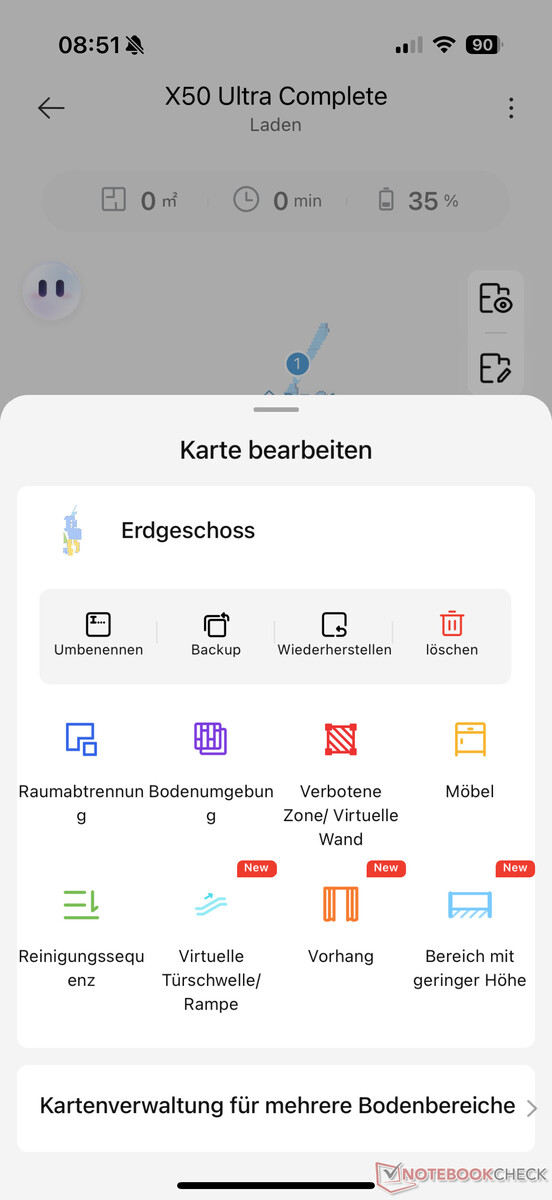 Bei dieser legt der Roboter binnen weniger Minuten eine virtuelle Karte seiner Umgebung an. Diese umfasst anschließend die einzelnen Räume, die in unserem Praxis-Test zuverlässig erkannt und sogar zum Großteil richtig benannt wurden. Auf Wunsch lässt sich hier manuell nacharbeiten, z. B. durch Benennung, Trennen und Zusammenlegen von einzelnen Räumen oder die Einrichtung von Sperrzonen. Auch die Angabe von Bodenmaterial oder die Festlegung der Reinigungsreihenfolge sind mittlerweile handelsüblich. Zudem lassen sich auf Wunsch virtuelle Möbel in der Karte platzieren sowie Bereiche von hohen Türschwellen/Rampen, Vorhängen und mit geringer Höhe (für VersaLift LiDAR) manuell festlegen.