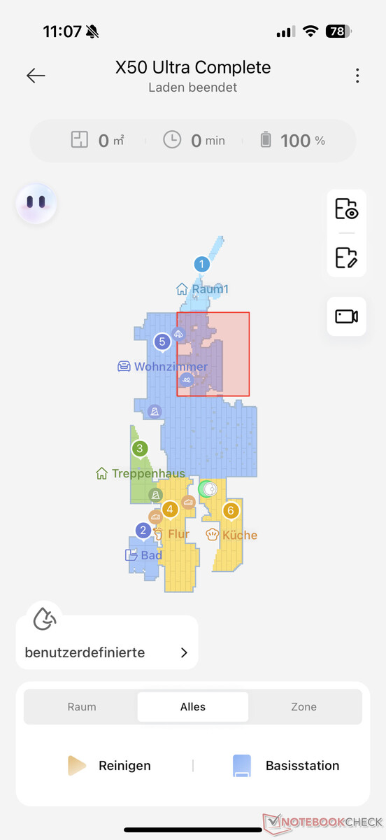 Bei der Akkulaufzeit hat der Dreame X50 Ultra Complete etwas überrascht - im Negativen. Während die meisten Saugroboter in unserer Testumgebung verteilt auf mehrere Reinigungsvorgänge über 100 Quadratmeter mit einer Akkuladung geschafft haben, war beim neuen Flaggschiff von Dreame bereits nach rund 80 Quadratmetern und 110 Minuten Gesamtdauer Schluss. Als Einstellungen haben wir gewohnt die üblichen Standardeinstellungen (Saugen und Wischen, Standard-Saugleistung, mittlere Feuchtigkeit) gewählt.
