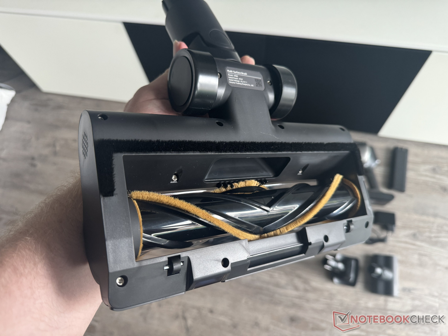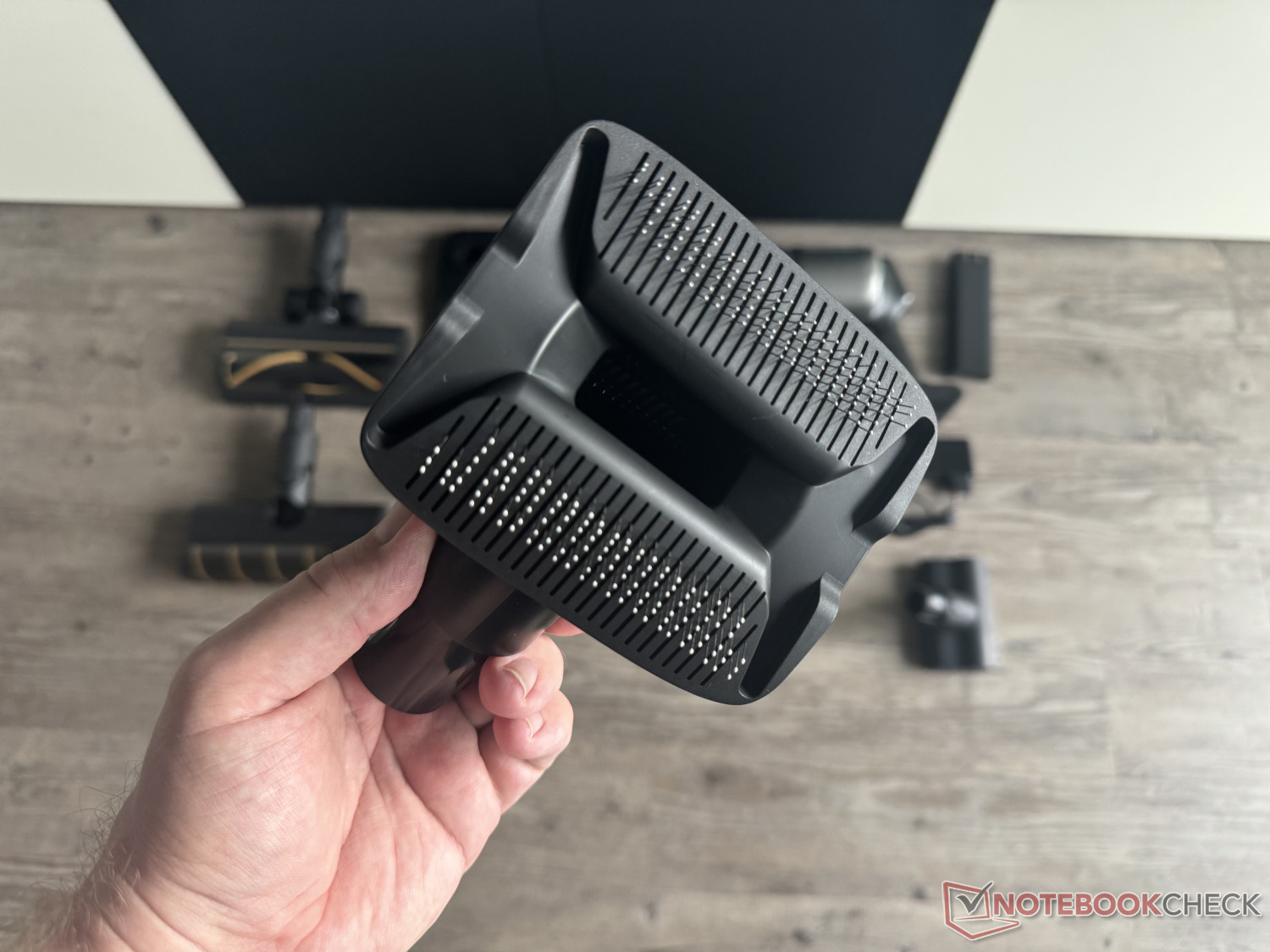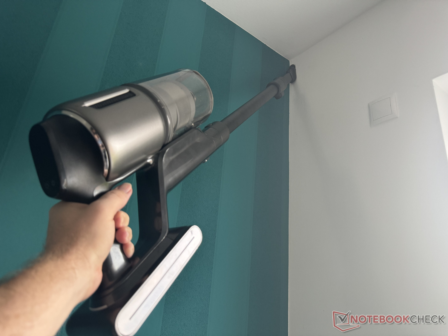 Ein Teil des Zubehörs samt dem Staubsauger selbst findet auf dem Bodensockel Platz. Allerdings wird der Sauger dort nicht auch automatisch geladen, was praktisch wäre. Stattdessen muss das mitgelieferte Ladegerät am Handgriff eingesteckt werden, um den 8 x 3.200 mAh großen Akku zu laden. Für diesen verspricht der Hersteller eine Laufzeit von bis zu 90 Minuten, was aber natürlich abhängig vom eingestellten Reinigungsmodus ist.