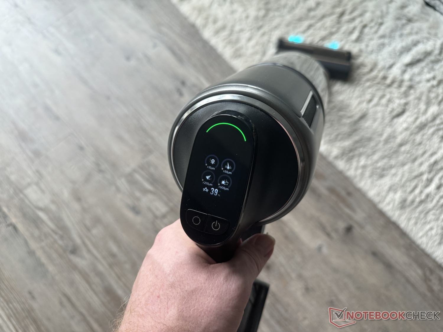 Bedient wird das Gerät über zwei Tasten unter dem Display und nicht (wie bei manch anderen Geräten) über einen "Pistolenabzug" am Handgriff. Der Bildschirm liefert nicht nur Informationen zum aktuellen Saugmodus, sondern auch über die Akkurestlaufzeit sowie die Zusammensetzung des aufgesaugten Drecks. Dieser wandert in den 0,6 l großen und transparenten Staubbehälter, der sich mit einem Tastendruck vom Gerät entfernen und mit einem weiteren über der Mülltonne auskippen lässt.