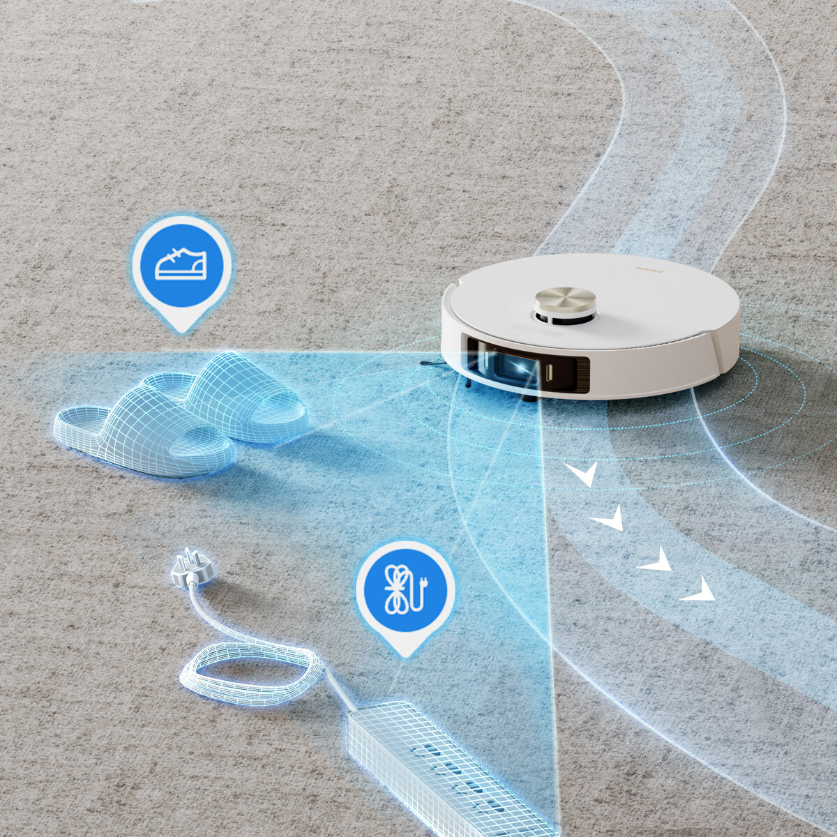 Auch die zentrale Gummibürste ist anhebbar und ermöglicht eine einfache Haarentfernung. Die Saugkraft des Vormax-Saugsystems beträgt 7.000 Pa. Die Pathfinder Smart Navigation tastet mithilfe von künstlicher Intelligenz und 3D-Lichtkernennung den Raum vor dem Gerät ab, um Hindernisse zu erkennen und zu umfahren.