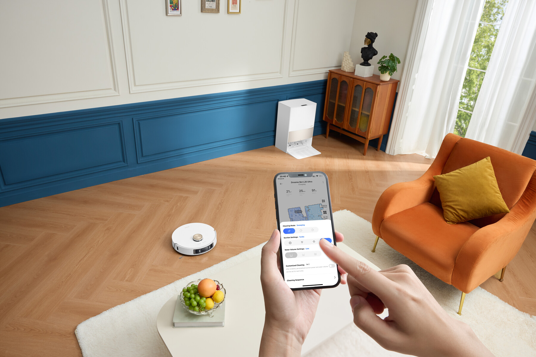 Die mitgelieferte Reinigungsstation leert nicht nur den Staubbehälter und soll so bis zu 75 Tage automatisches Saugen ermöglichen, sondern reinigt und trocknet auch die Duo-Scrub-Wischmopps. Hierfür wartet sie neben einem 3,2 Liter großen Staubbeutel auch mit einem 4,5 Liter großen Wassertank sowie beigemischtem Reinigungsmittel auf.