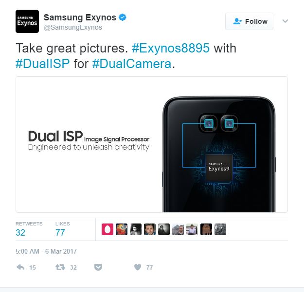 Samsung verkündete gestern auf Twitter, dass der kürzlich vorgestellte Exynos 8895-Prozessor, der wie der Snapdragon 835 von Qualcomm im energiesparenden 10 nm-FinFET-Verfahren produziert wird, mit doppelt ausgeführtem Image Signal Prozessor (ISP) ausgestattet ist und somit auch Dual-Cams unterstützt. An sich nichts außergewöhnliches, mittlerweile tun das alle aktuellen mobilen Chipsätze. Die Tatsache, dass Samsung aber bisher kein Smartphone mit Dual-Cam im Angebot hat und auch das demnächst erscheinende Galaxy S8 offensichtlich keine an Bord haben wird, befeuert nun erste Gerüchte zum Nachfolger des eingestampften Galaxy Note 7 aus dem Vorjahr.
