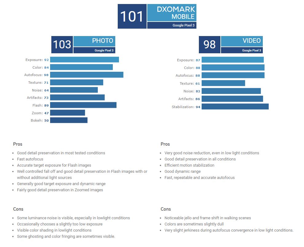 Im Vergleich zum Pixel 2, das ehemals noch zu den besten Kamera-Handys zählte, hat Google laut DxOMark insbesondere beim Zoom und bei der Bokeh-Qualität deutlich zugelegt, mit der Zoomqualität einer dedizierten Telefoto-Optik kann Google aber dennoch nicht mithalten. Nicht getestet wurde übrigens der spezielle Nachtmodus, der zu den besten der Industrie zählt und für den einen oder anderen eventuell ein wichtiges Entscheidungskriterium darstellt. Ebenfalls top sind die Videoqualitäten des Single-Cam-Smartphones, hier erreicht das Pixel 3 sogar 2 Punkte mehr als das iPhone Xr im Sub-Score.