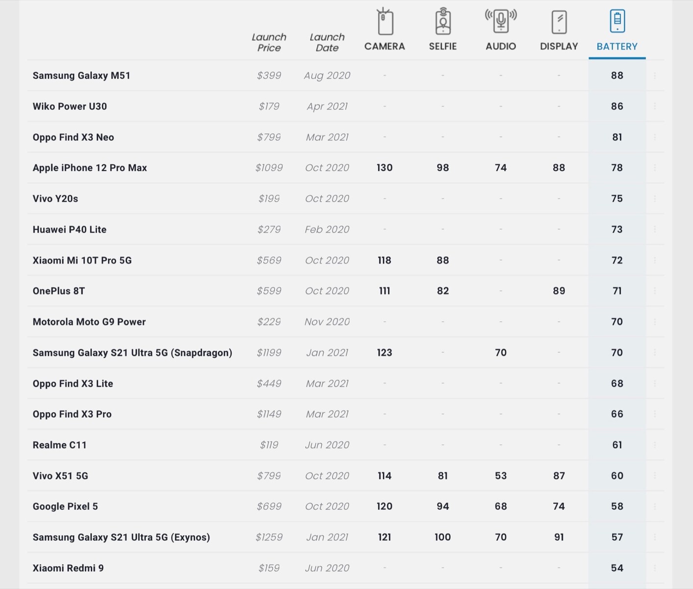 Diese wird derzeit vom Samsung Galaxy M51 mit 88 Punkten angeführt, das schon in unserem eigenen Test mit einer enorm langen Laufzeit beeindrucken konnte – kein Wunder, schließlich verbaut Samsung einen Akku, der beachtliche 7.000 mAh fasst, sowie einen sparsamen Qualcomm Snapdragon 730G. Auch das Apple iPhone 12 Pro Max schneidet mit 78 Punkten recht gut ab, zumindest deutlich besser als das Samsung Galaxy S21 Ultra (ca. 1.050 Euro auf Amazon).