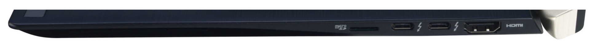 Das Notebook hat einen USB-3.2-Gen-1-Anschluss (Typ-A-USB) und zwei Thunderbolt-3-Steckplätze (Typ-C-USB) an Bord. Letztere unterstützen Displayport-per-USB-C und Power Delivery. Das X40 wird mittels des mitgelieferten Typ-C-USB-Netzteils mit Energie versorgt. Einen proprietären Netzteilanschluss bringt der Rechner nicht mit. Der verbaute MicroSD-Speicherkartenleser gehört zu den langsamen Vertretern seiner Art.