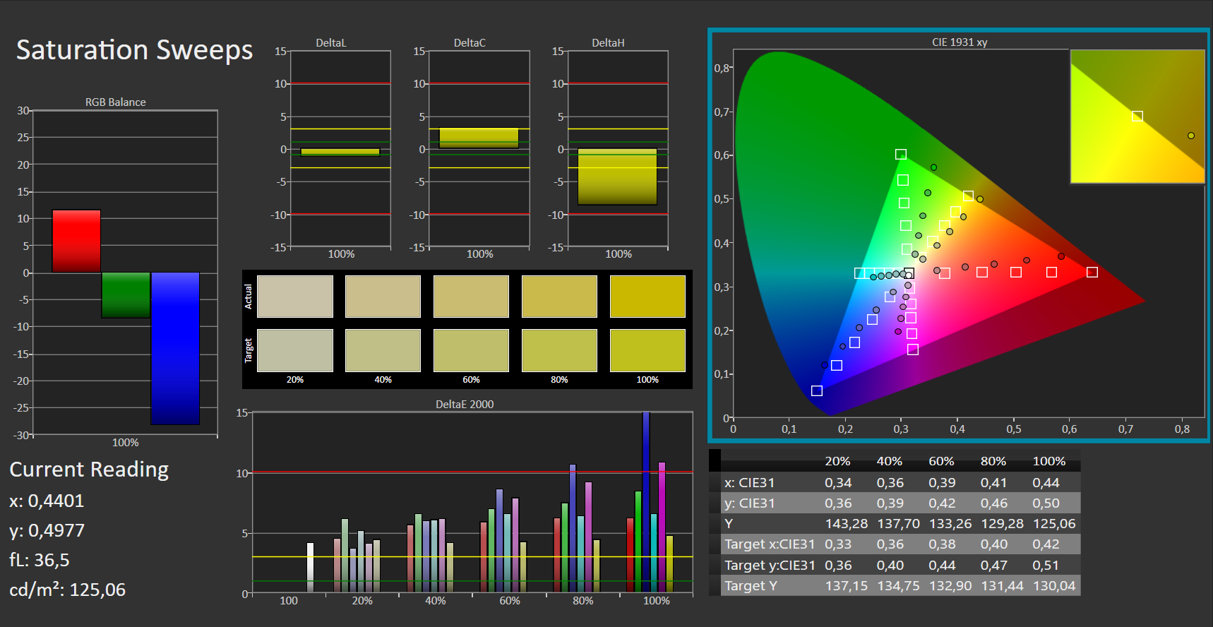 | Farbraum (Prozent von AdobeRGB 1998) (%) | 35 | 36 3% | 37 6% | 36.4 4% |