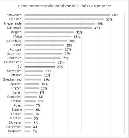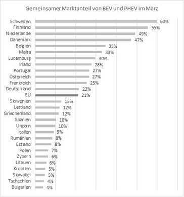 Deutlich seltener werden Elektroautos in Osteuropa verkauft. In Polen betrug der Marktanteil von rein elektrisch angetrieben Autos im März sehr geringe 4 Prozent, in der Tschechischen Republik 3 Prozent und in der Slowakei sogar nur 2 Prozent. Auch in Südeuropa ist der Anteil reiner Elektroautos nach wie vor sehr niedrig: Italien 5 Prozent, in Spanien bei 4 Prozent.
