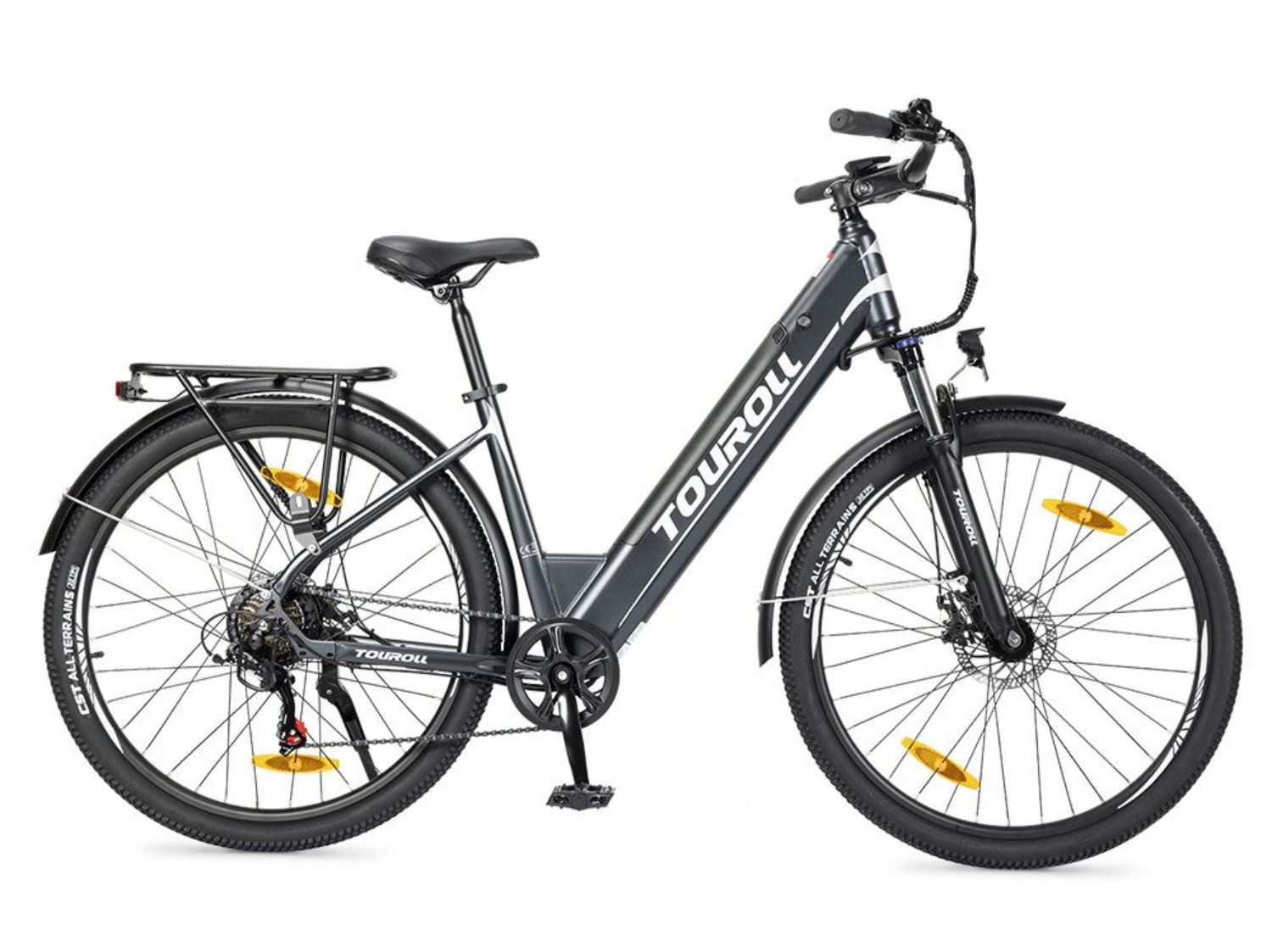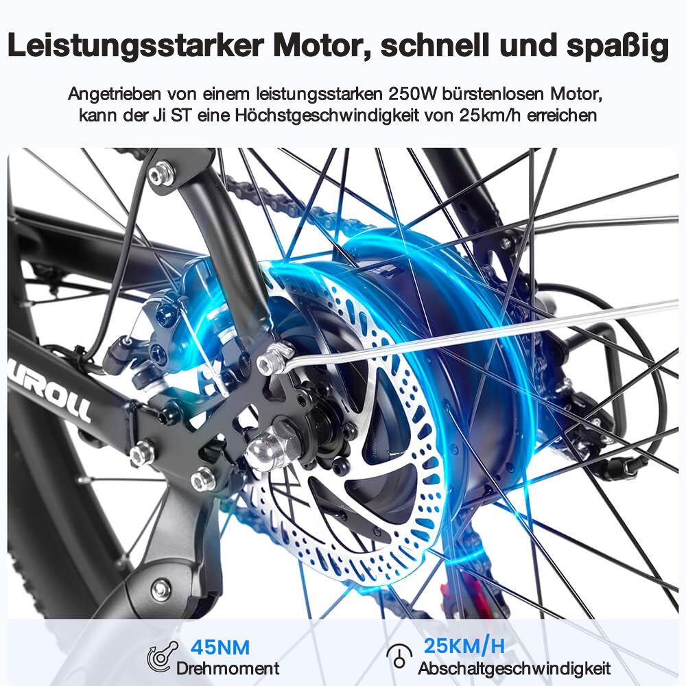 Trotz seines derzeit besonders kleinen Preises von unter 750 Euro bietet das Touroll J1 ST eine beachtliche Ausstattung und Leistung. Für elektrische Tretunterstützung bis 25 km/h sorgt in dem Pedelec ein 250 W bürstenloser Motor mit beachtlichen 45 Nm Drehmoment, fünf Unterstützungsstufen sowie 6-km/h-Gehmodus.