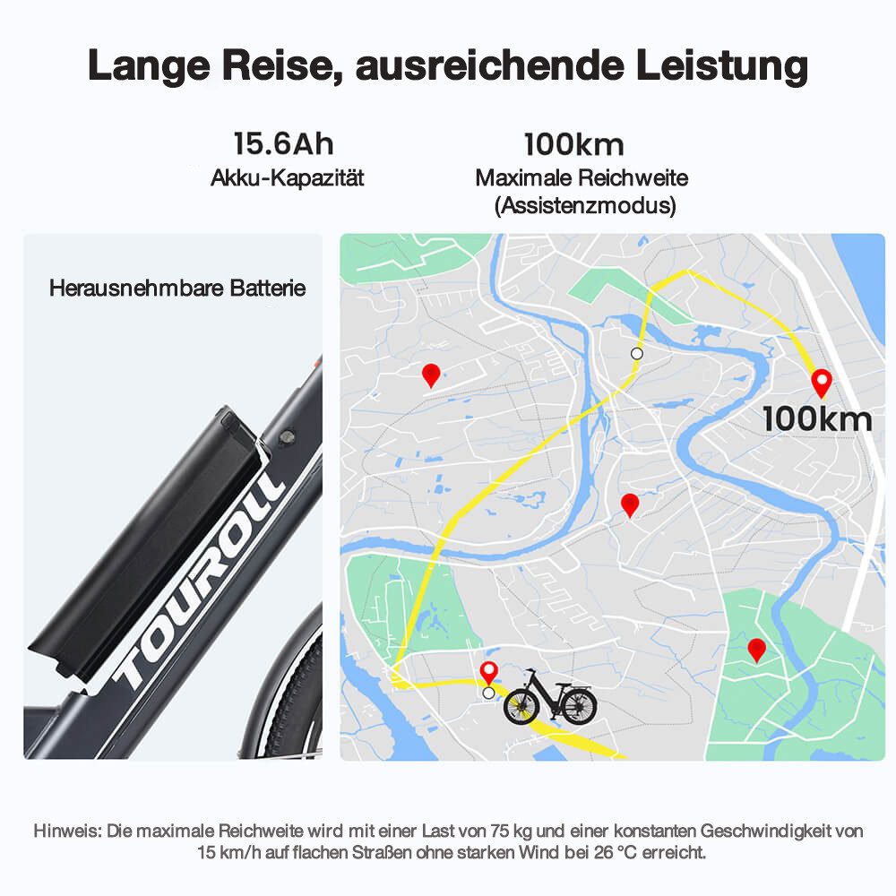 Noch beeindruckender ist die Reichweite. Die liegt mit einer Ladung des 561,6 Wh großen Lithium-Ionen-Akku, der entnehmbar im Rahmen des E-Bikes untergebracht ist, bei bis zu 100 km im Unterstützungsmodus. Somit muss auch bei ausgedehnten Touren nicht auf den Komfort des elektrischen Antriebs verzichtet werden.