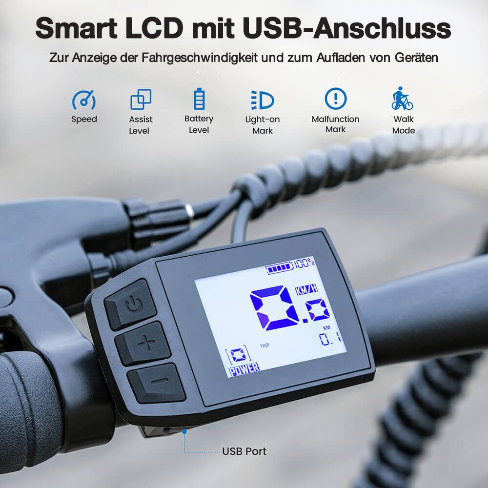Das LCD-Display am Lenker informiert nicht nur über den Akkustand und weitere wichtige Fahrdaten. Sondern es bietet auch einen USB-Anschluss, sodass über den Akku des E-Bikes beispielsweise ein Smartphone geladen werden kann.