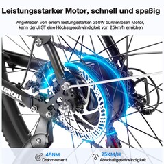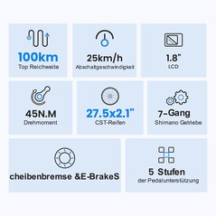 Für stets den richtigen Gang sorgt eine 7-Gang-Schaltung von Shimano, während die Federgabel mit 80 mm Federweg für noch mehr Komfort sorgt und Bodenunebenheiten ausbügelt. Gefahren wird auf 27,5x2,1 Zoll messenden Premium-Gummireifen.