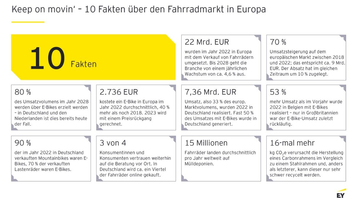 Die aktuellen Durchschnittskosten für ein E-Bike in Europa liegen bei 2.736 Euro und werden voraussichtlich im nächsten Jahr auf 2.604 Euro sinken. Der Branchenumsatz wird jedoch aufgrund steigender Absatzzahlen weiter wachsen. In diesem Jahr wird europaweit ein Wachstum von 1,7 Prozent auf 22,5 Milliarden Euro erwartet, verglichen mit 13 Milliarden Euro im Jahr 2018, berichten die Marktexperten von Ernst & Young (EY).