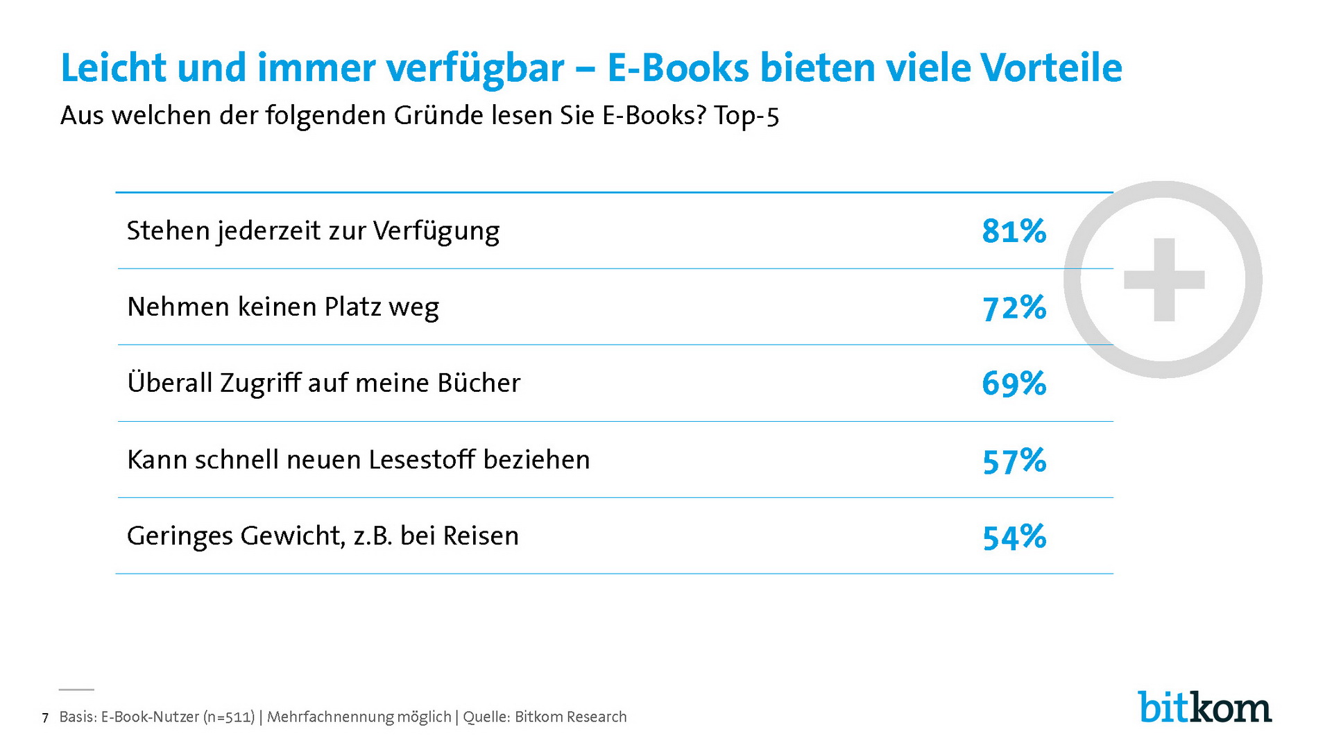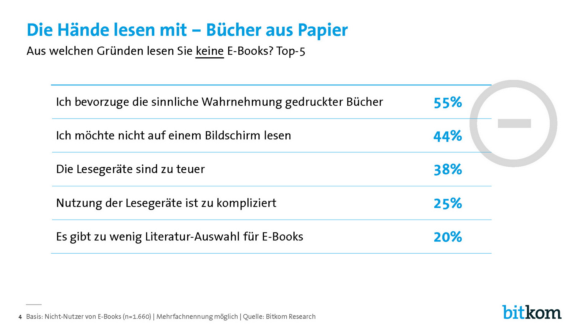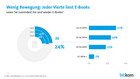 Allerdings entscheidet nicht nur der Preis, ob jemand E-Books liest. 55 Prozent der Nichtnutzer bevorzugen die sinnliche Wahrnehmung von gedruckten Büchern. 44 Prozent geben an, dass sie nicht auf einem Bildschirm lesen wollen. 38 Prozent sind die Lesegeräte zu teuer und jedem Vierten (25 Prozent) ist die Nutzung zu kompliziert.