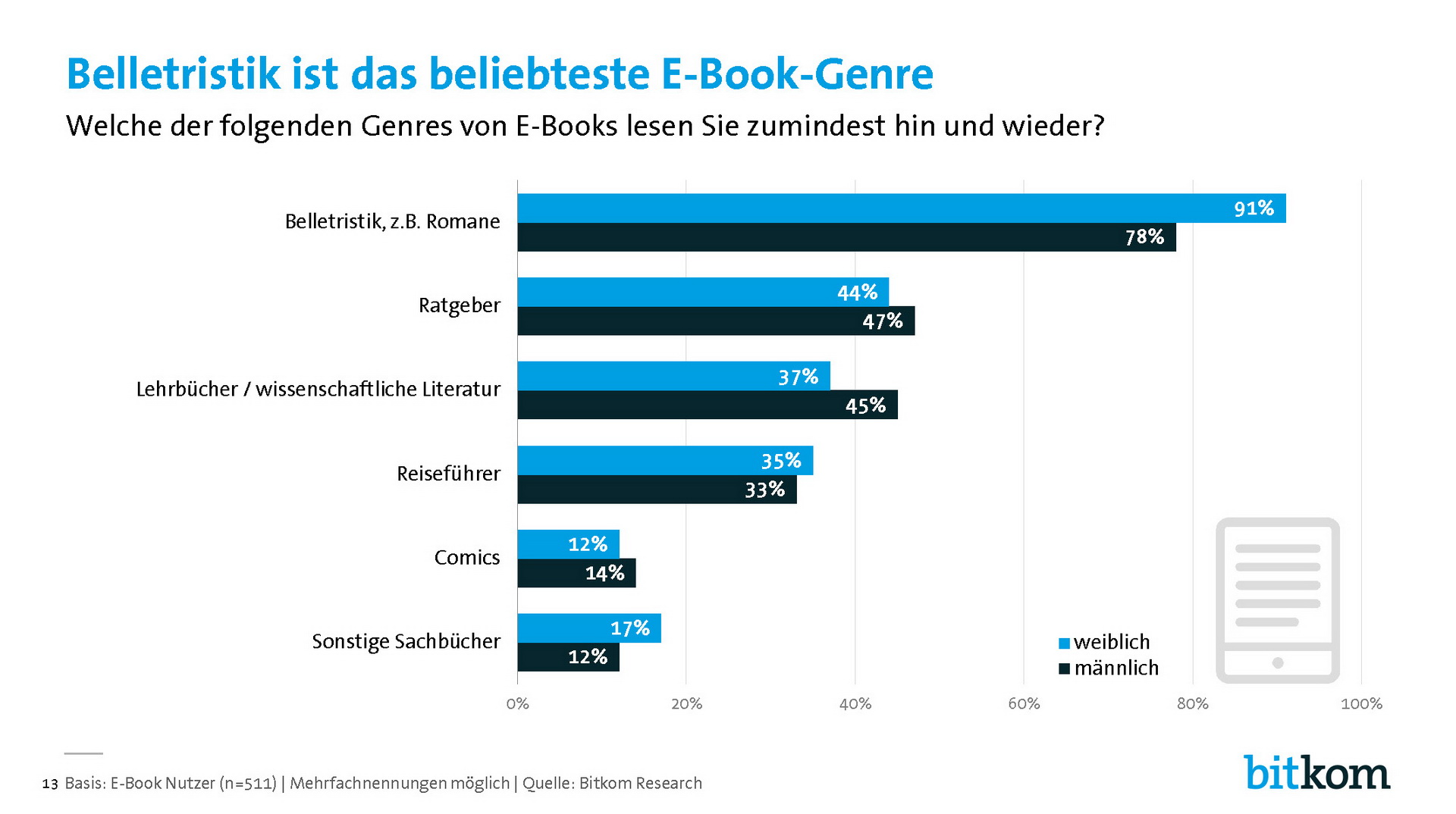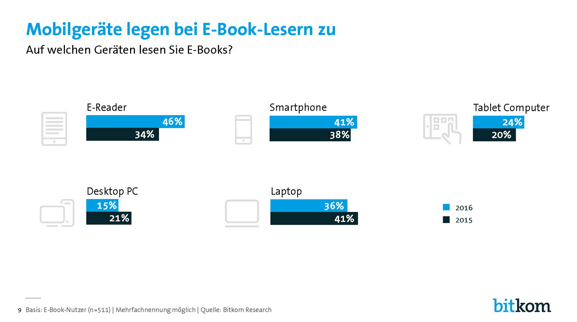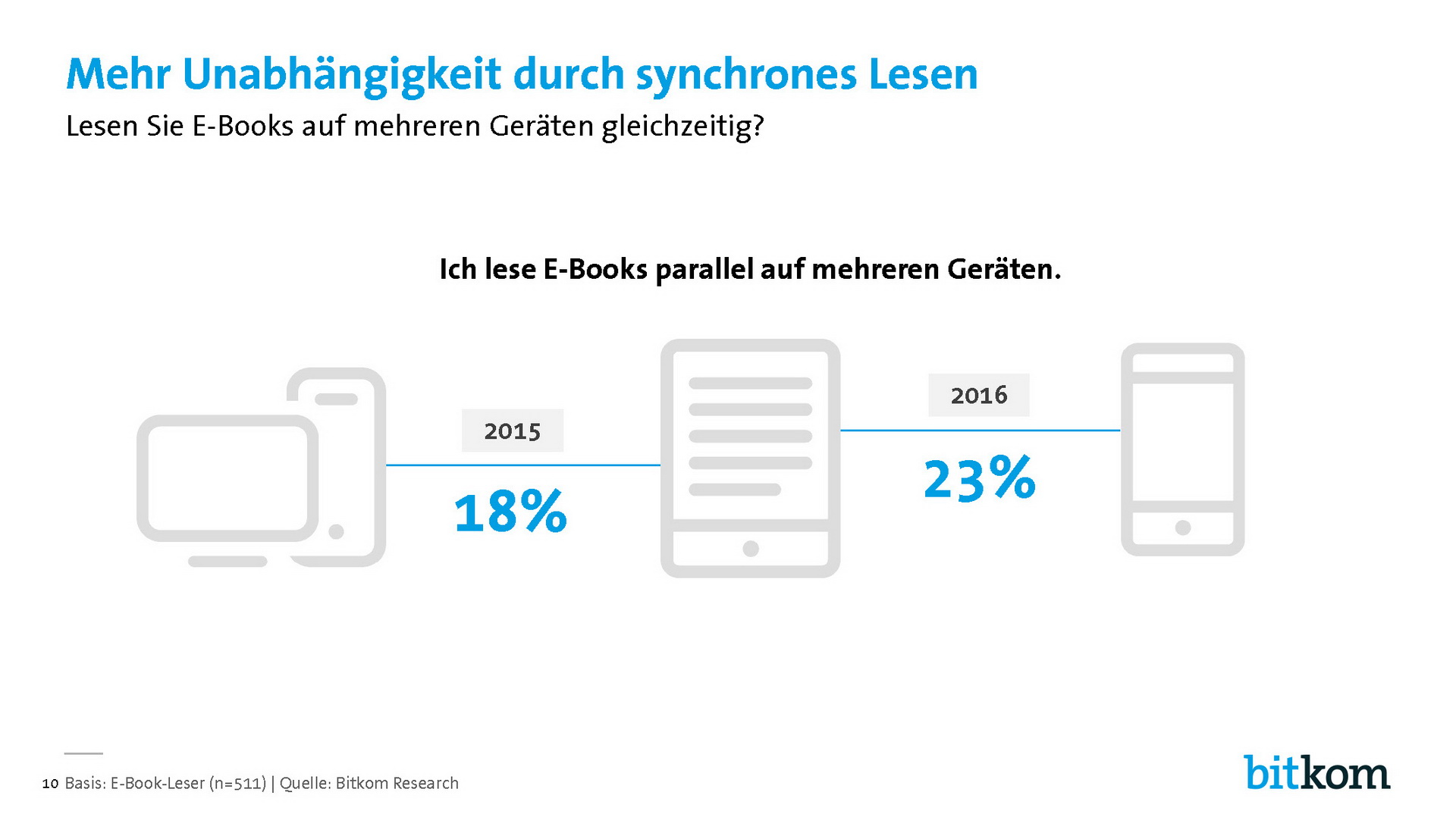 Nach den Ergebnissen der Studie sind in diesem Jahr erstmals E-Reader das bevorzugte Lesegerät. 46 Prozent der E-Book-Leser nutzen Geräte wie Kindle, Tolino oder Kobo. Generell werden primär Mobilgeräte eingesetzt: 41 Prozent lesen E-Books auf dem Smartphone und 24 Prozent auf einem Tablet Computer. Dabei geht der Trend zum synchronen Lesen. Laut Umfrage liest fast jeder vierte E-Book-Nutzer (23 Prozent) digitale Bücher auf mehreren Geräten parallel (Vorjahr: 18 Prozent).