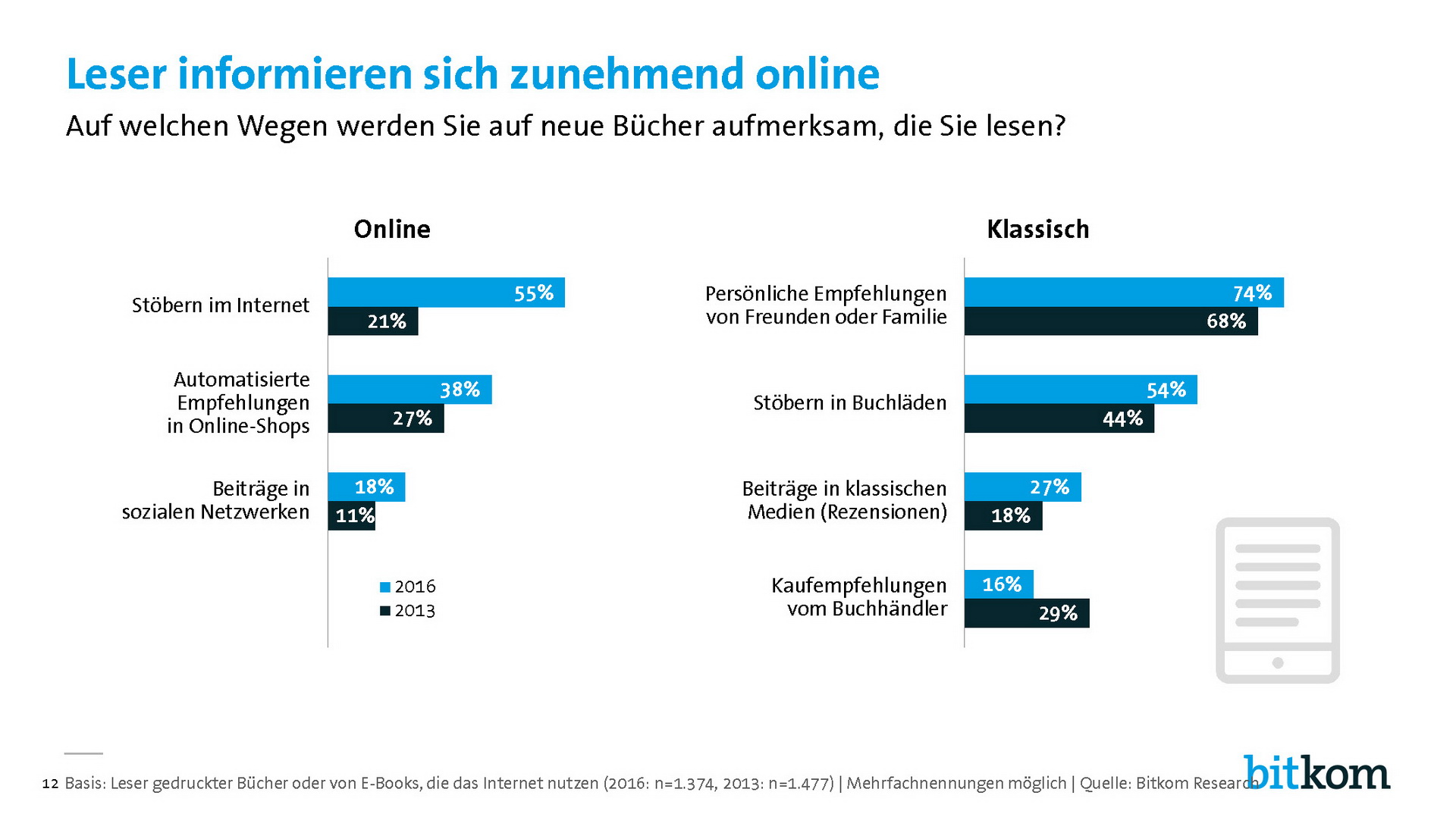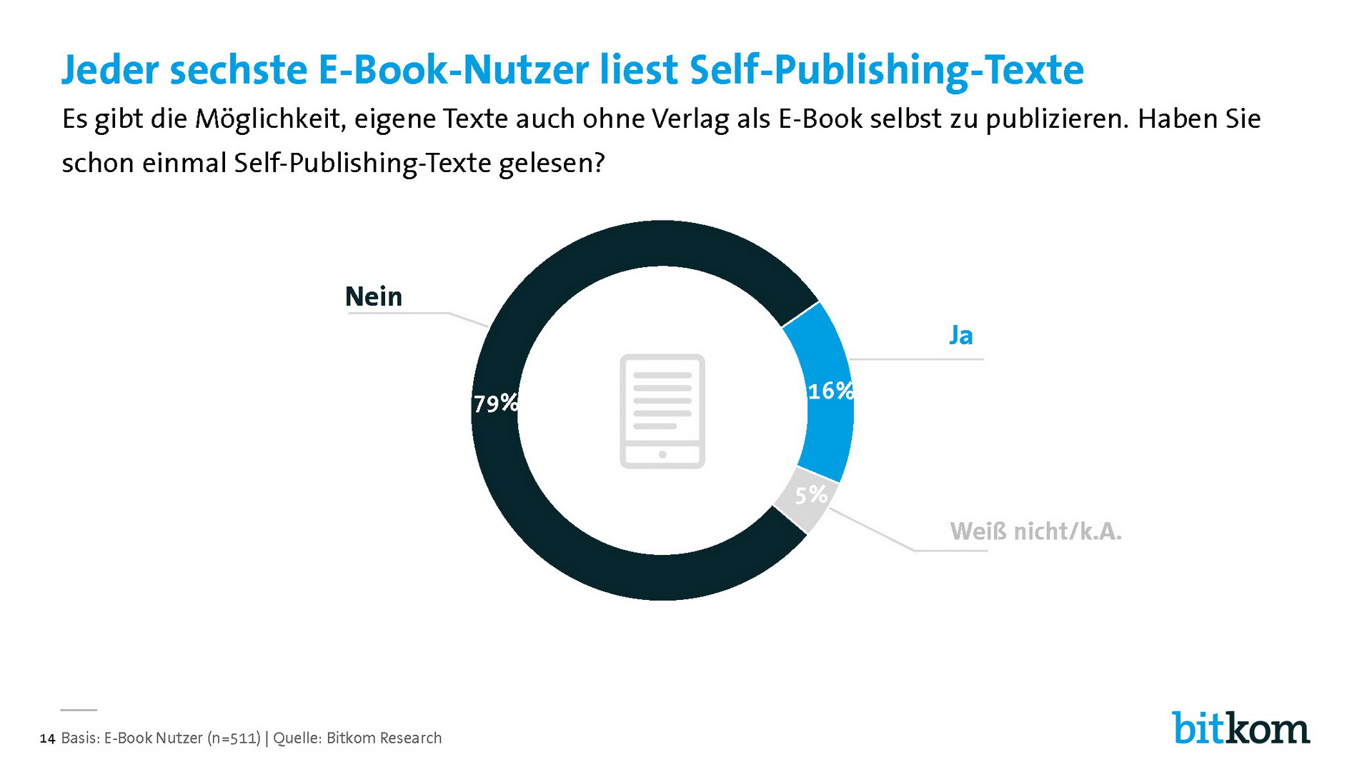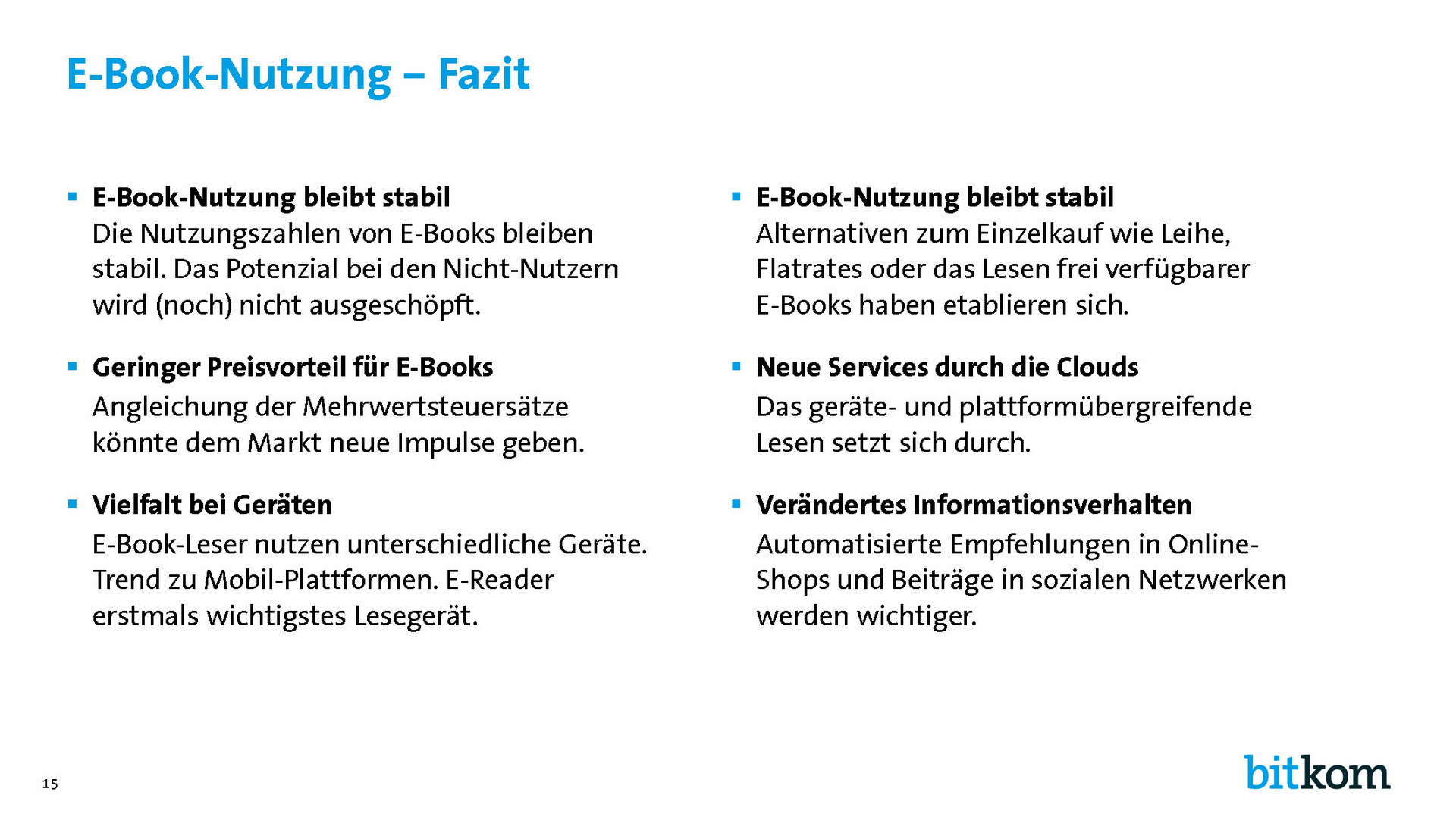 "Die Nutzung digitaler Bücher in Deutschland stagniert - trotz innovativer Nutzungsmodelle und einer steigenden Verbreitung mobiler Lesegeräte. Der E-Book-Markt braucht neue Impulse, um wieder in Fahrt zu kommen. Es reicht nicht aus, gedruckte Bücher eins zu eins in ein digitales Format zu übertragen. Die Verlage sind in der Lage, Inhalte zu strukturieren und für bestimmte Zielgruppen aufzubereiten - ein unschätzbarer Vorteil in den Informationsfluten des Internet. Wenn am Ende kein einfaches E-Book, sondern eine benutzerfreundliche, interaktive App oder Webanwendung steht, werden sich dafür erst Recht Käufer finden."