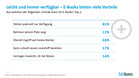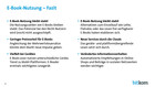 In der Regel kaufen die Nutzer einzelne E-Books bei Online-Buchshops wie Amazon, ebook.de, Thalia.de oder buch.de (86 Prozent). Jeder Vierte (27 Prozent) leiht sich E-Books bei öffentlichen Bibliotheken aus. Daneben gewinnen kommerzielle Flatrate-Modelle an Bedeutung. Bei Anbietern wie Skoobe oder Kindle Unlimited zahlen die Kunden eine monatliche Pauschale und haben Zugriff auf eine große Auswahl an Büchern. 13 Prozent der befragten E-Book-Leser nutzen einen solchen Abo-Dienst. Ebenso viele (14 Prozent) nutzen kostenlose, frei verfügbare E-Books. 6 Prozent der Befragten zahlen pro Seite, was vor allem bei wissenschaftlichen Publikationen von Bedeutung ist.