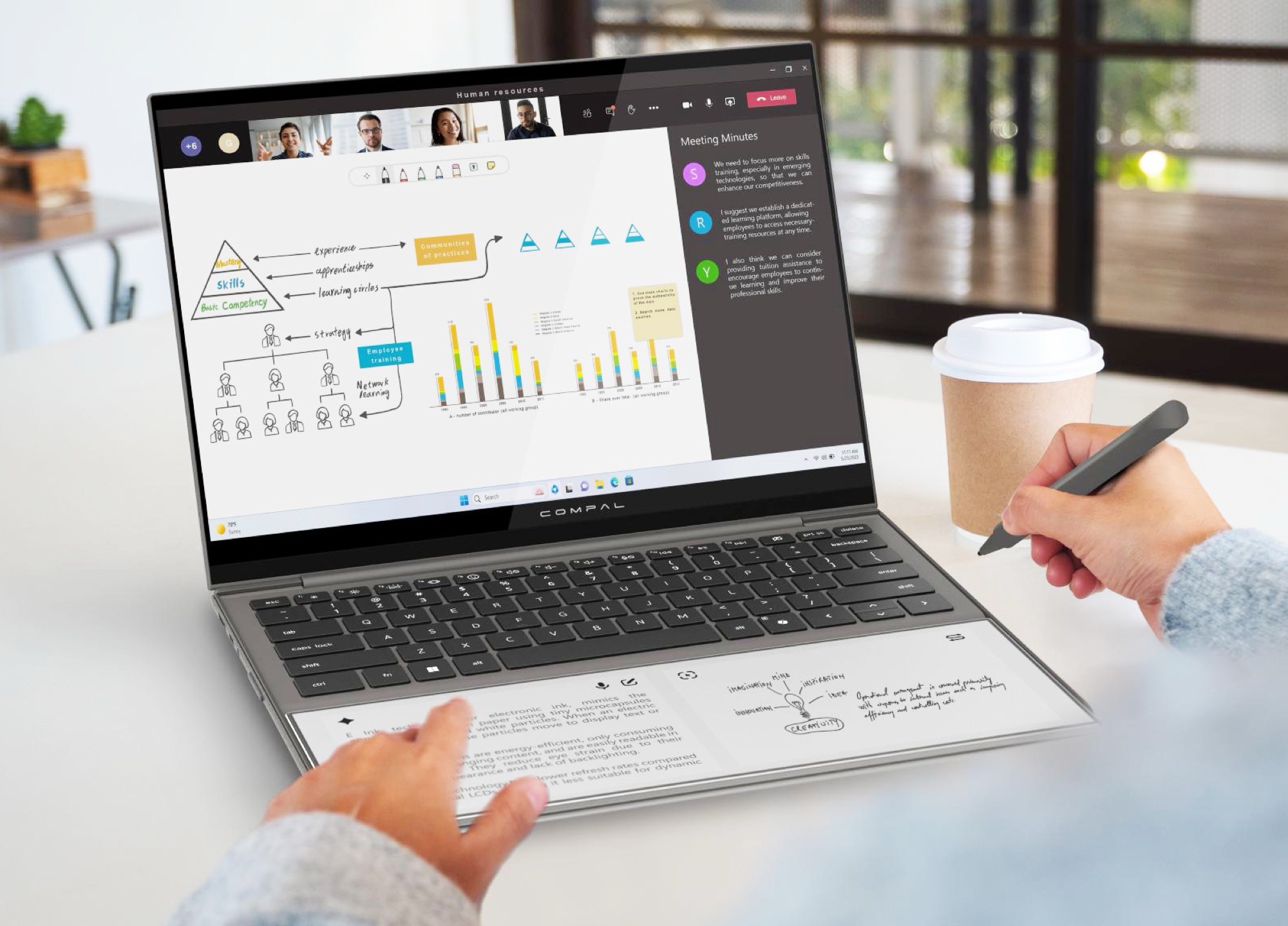 Währen das Display und die Tastatur wie bei einem handelsüblichen Laptop aussehen, ersetzt Compal die Handballenauflage samt Trackpad durch einen Touchscreen, der auf einem E-Ink-Panel basiert. Durch E Ink ist dieses Panel besonders energiesparend, und bleibt selbst dann sichtbar, wenn der Laptop ausgeschaltet ist. Dieser Touchscreen kann als Trackpad verwendet werden, lässt sich durch einen Stylus aber auch als Zeichentablett nutzen.